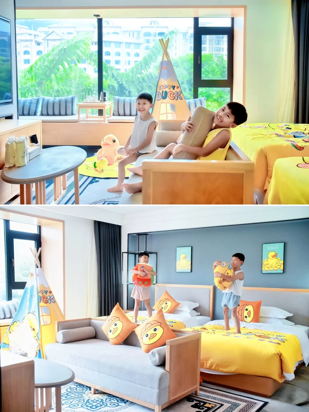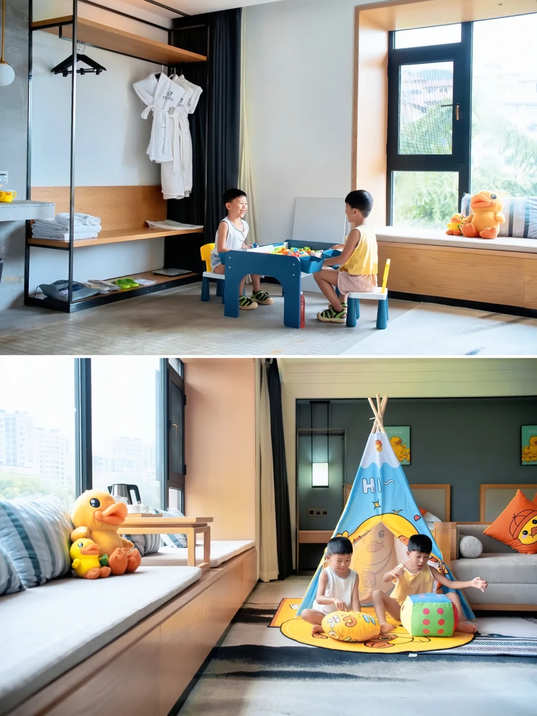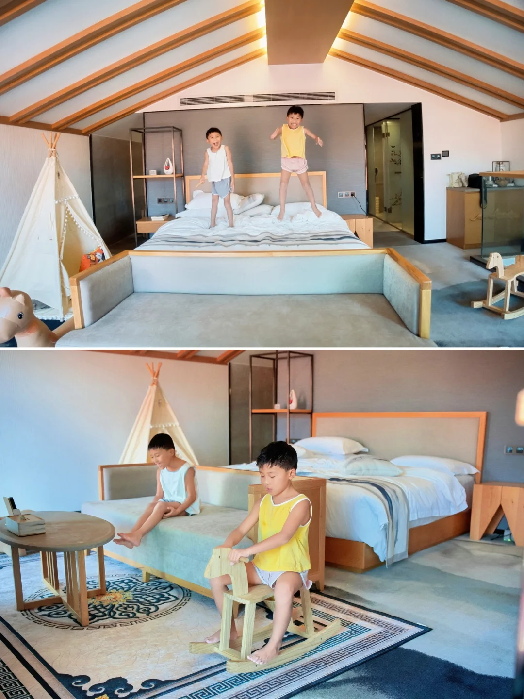 房间我们住了亲子套房和小黄鸭亲子房,都非常宽敞。地面铺了软软的地毯,小朋友闹腾也不怕摔。我父母住的是星空泡池房,房间里就有一个很大的泡池,晚上躺着看星星太惬意了。
