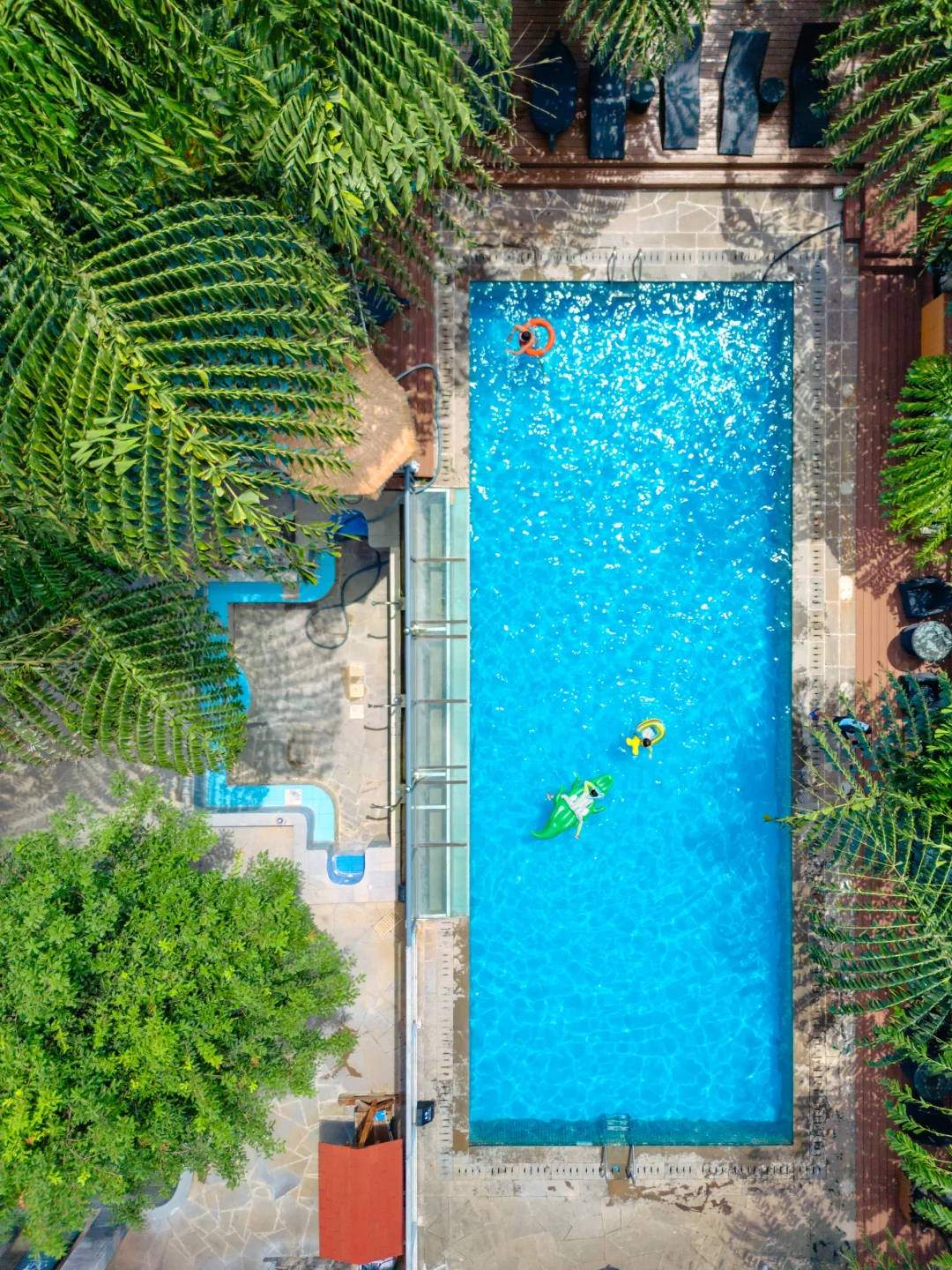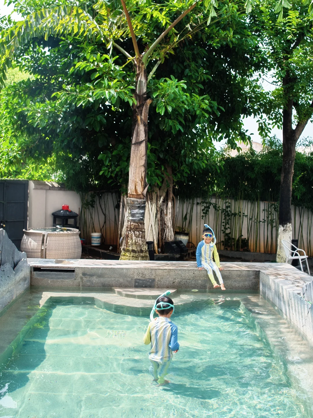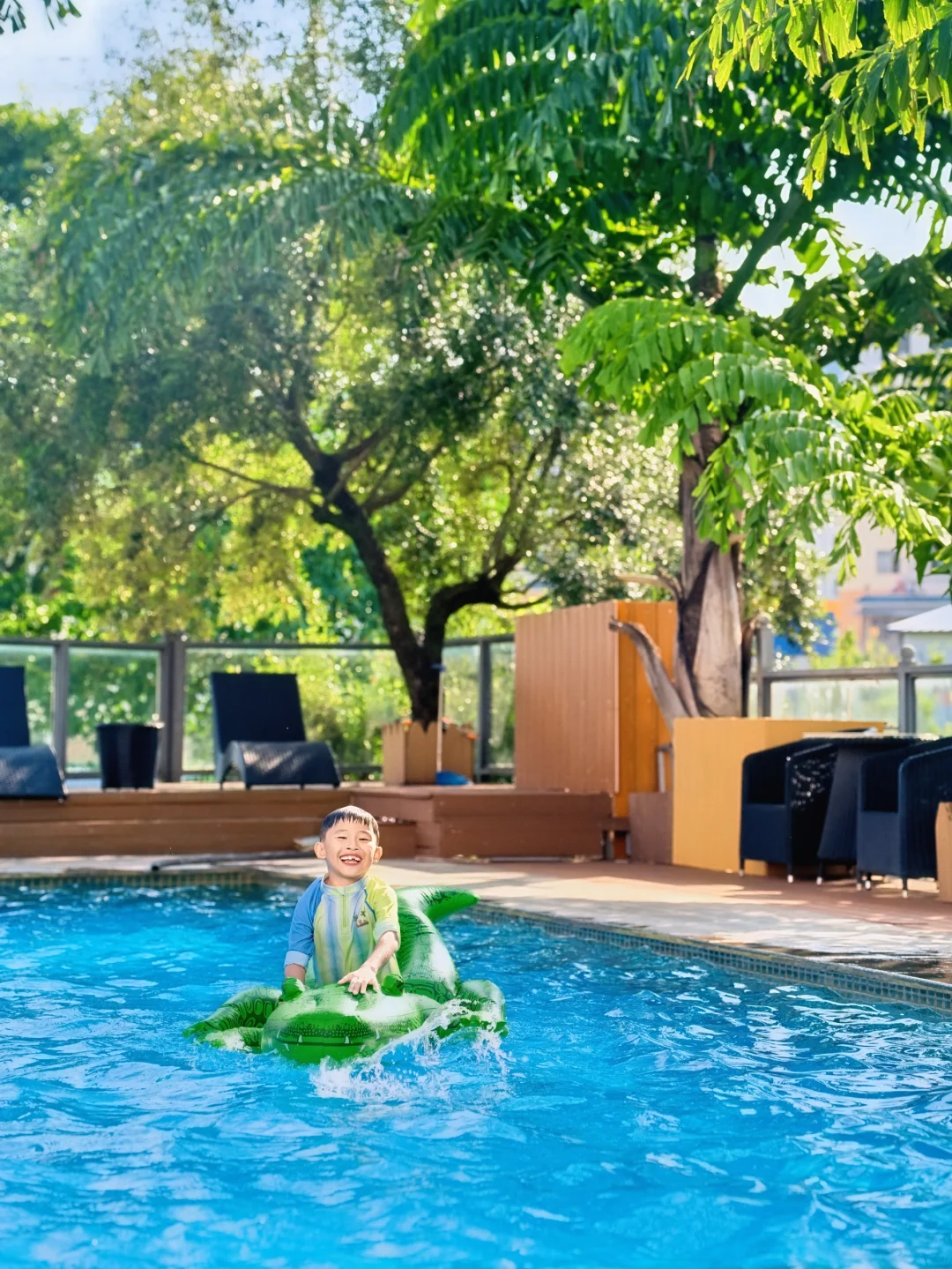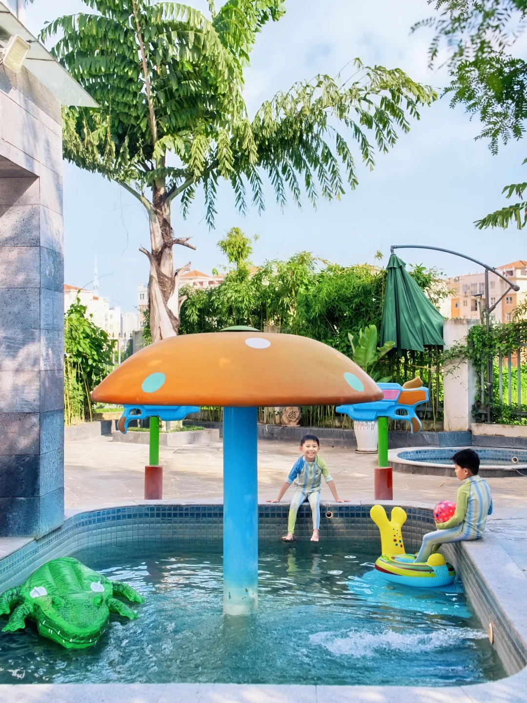 最得我家俩小子欢心的,是公区超大的梦幻游泳池。水温比温泉池稍低些,夏天正好让娃在里面乘风破浪,娃像两条小鱼似的在水里钻来钻去,老父亲真的很省心!
