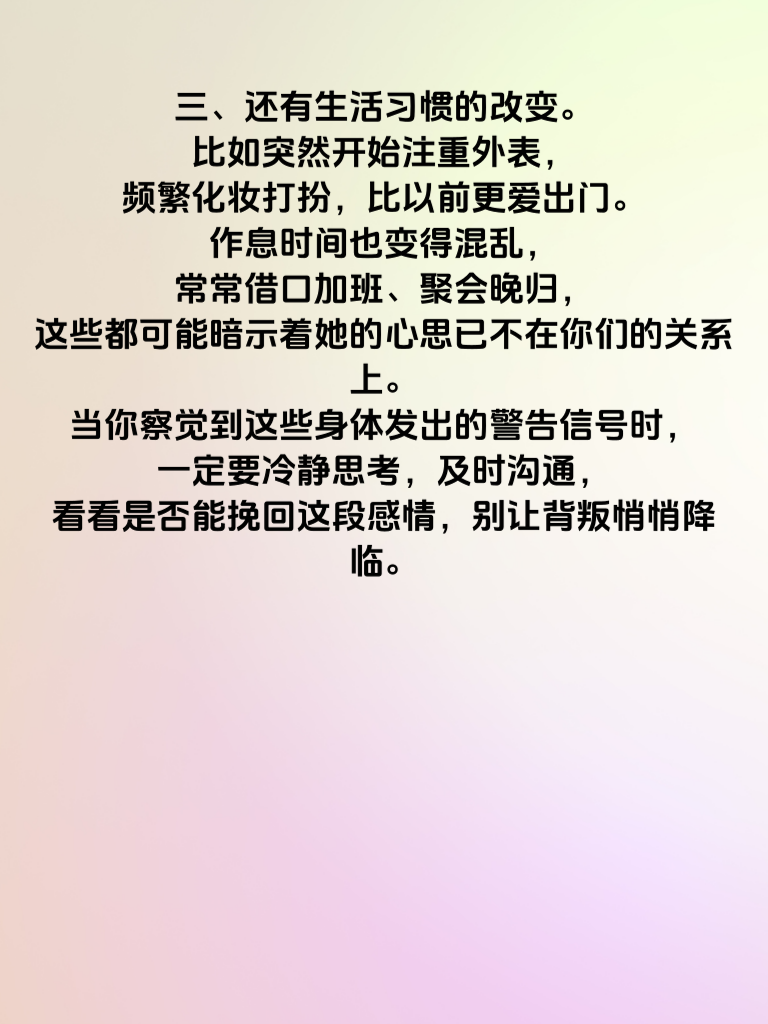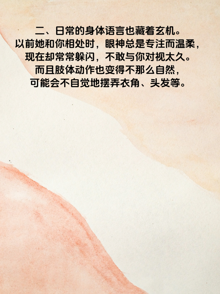 一、女生出轨前,身体往往会发出一些微妙信号。首先,在亲密接触上可能会有变化。原本热情回应你的拥抱亲吻,突然变得敷衍,甚至开始回避,这或许是她内心有了新状况的表现。 二、日常的身体语言也藏着玄机。以前她和你相处时,眼神总是专注而温柔,现在却常常躲闪,不敢与你对视太久。而且肢体动作也变得不那么自然,可能会不自觉地摆弄衣角、头发等。 三、还有生活习惯的改变。比如突然开始注重外表,频繁化妆打扮,比以前更爱出门。作息时间也变得混乱,常常借口加班、聚会晚归,这些都可能暗示着她的心思已不在你们的关系上。当你察觉到这些身体发出的警告信号时,一定要冷静思考,及时沟通,看看是否能挽回这段感情,别让背叛悄悄降临。