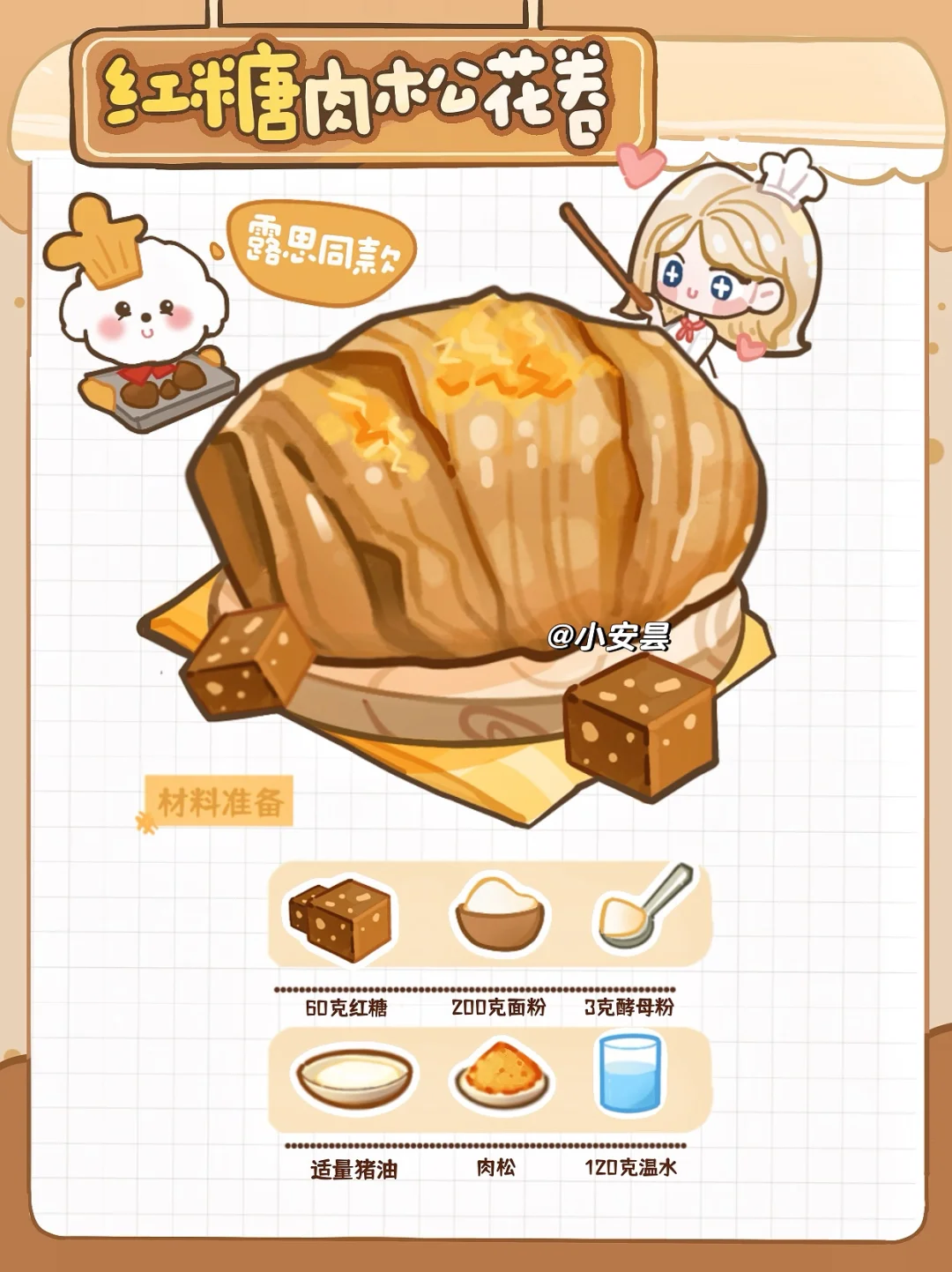 60克红糖➕200克面粉 ➕3克酵母粉➕适量猪油➕肉松➕120克温水(30-40℃,手感微温)