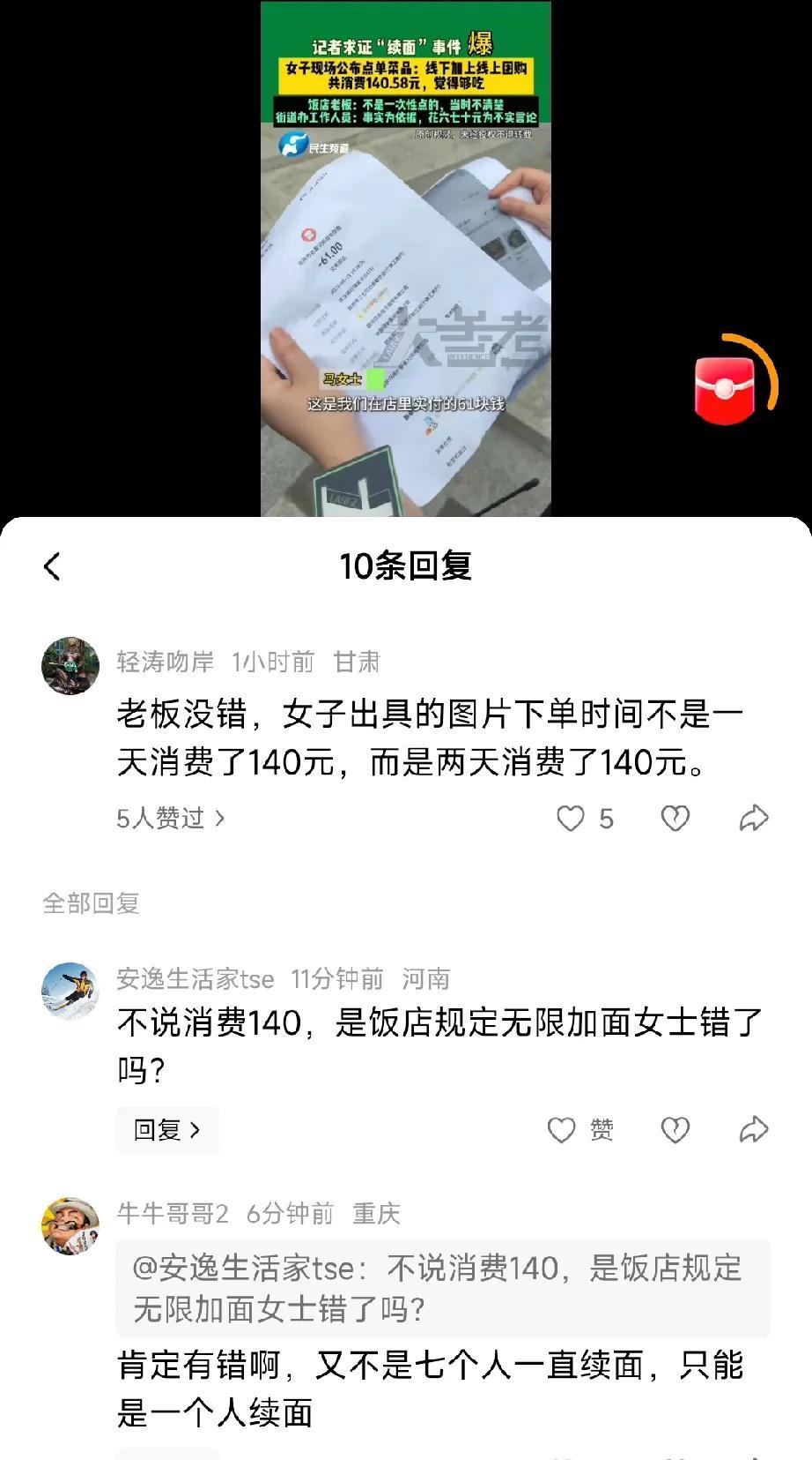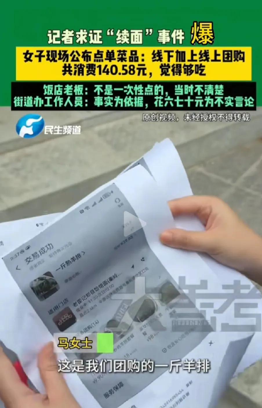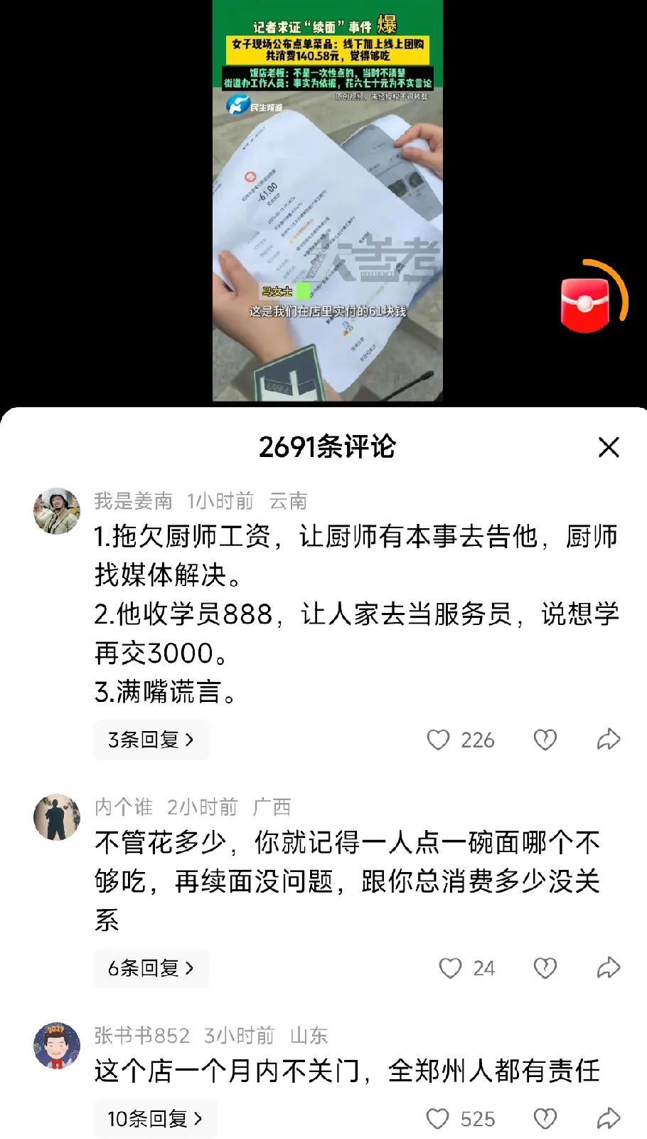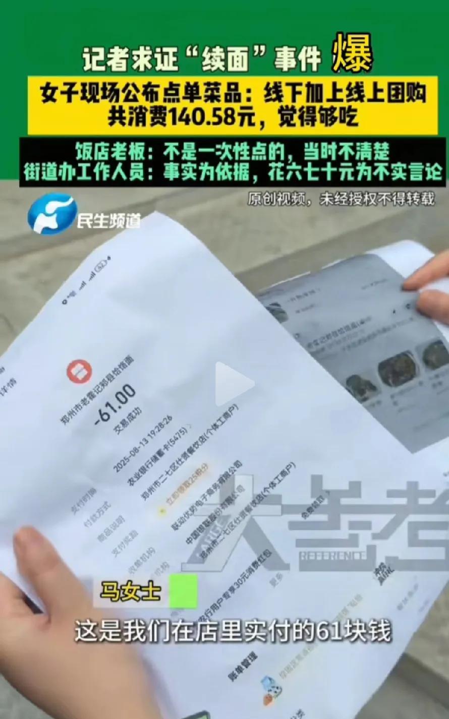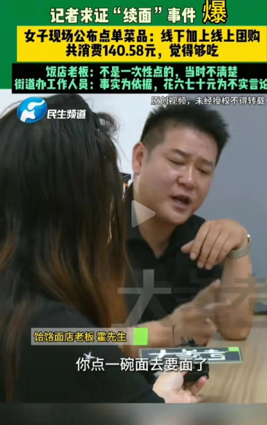 看到七个人吃一碗面我忍了 看到只消费了67元,我也忍了 可是看到老板的后续做法我实在忍不住了 郑州这起面馆“续面风波”,简直把我看傻了!本以为就是一碗面续不续的小事,结果像捅了马蜂窝,账单、爆料、吵架全冒出来,郁闷——这瓜咋比饸饹面还“劲道”? 马女士晒单:线下付61元,加上团购羊排、羊肉串,总共140.58元!还喊冤“第三次根本没续面”。可老板委屈:“又不是一次性点的,当时真不清楚!” 我晕,本来想“难道团购是跨天买的?” 但仔细一想,团购也是真金白银花出去的啊!街道办直接甩结账单:8月13日19:28堂食,4个人吃了精品凉菜、涮牛肚、团购串,原价61元。事实摆眼前,说“只花六七十”纯属胡扯,这账算得比麻花还拧巴! 更绝的在后头!网友连环“爆锤”:店主拖欠厨师工资,还放话“有本事去告”;收学员888元,先让人家当服务员,想学手艺再交3000!哎呀妈呀,这操作让我想起朋友踩的坑——交了钱学烘焙,结果天天洗碗,最后啥也没学到,钱还打了水漂!崩溃,这店主简直是“无赖界卷王”,谎话连篇,比烂剧本还荒谬! 总之,现在查清楚了客户是没有错的,这个老板很有问题,当地的监管部门检查一下#续面#