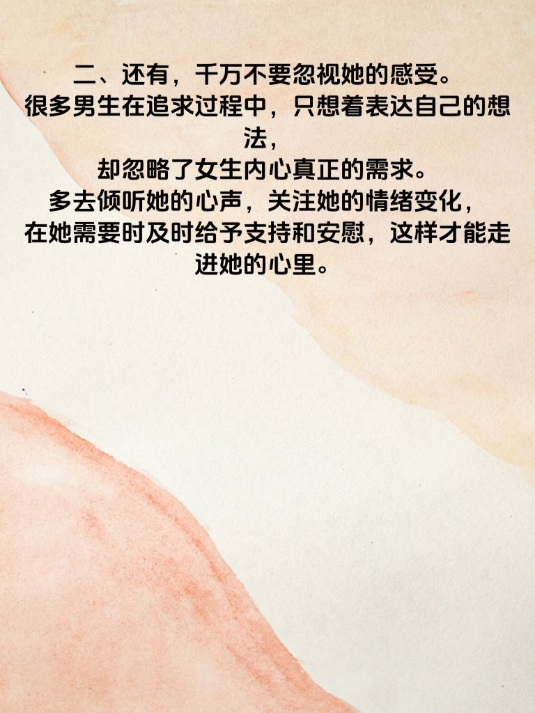 一、追求女生时,千万别过度急切。有些男生一遇到心仪的女生,就迫不及待地发起猛攻,每天消息轰炸,频繁邀约。可这样往往会让女生感到压力巨大,产生逃避心理。要知道,感情需要慢慢培养,给彼此一些时间和空间,循序渐进地增进了解,才更易让她接受你。 二、还有,千万不要忽视她的感受。很多男生在追求过程中,只想着表达自己的想法,却忽略了女生内心真正的需求。多去倾听她的心声,关注她的情绪变化,在她需要时及时给予支持和安慰,这样才能走进她的心里。 三、另外,别总是以自我为中心。追求女生不是单方面的付出,而是两个人的互动。不要一味地说自己的事,却对她的生活、兴趣毫无了解。尝试去融入她的世界,找到共同话题,让她感受到你们之间的契合,感情才能更稳固地发展。记住,追求女生需用心,避开这些错误,才能收获美好的爱情。