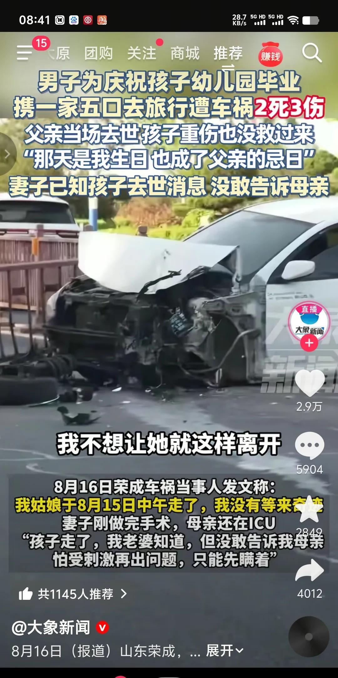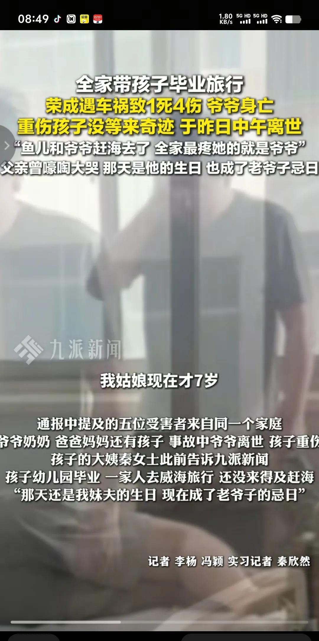旅游有时候并不是旅游,而是一次踏上死亡的归途。 山西太原,一家五口为庆祝7岁女儿幼儿园毕业,专程来山东荣成实现孩子赶海愿望。谁知大海还没看成,一家五口便在入住的荣成小区遭遇飞来车祸。爷爷当场死亡,七岁的钰儿经医院抢救后也不幸离世,爸爸手臂骨折,奶奶、妈妈无大碍。 8月5号爸爸的生日,同时也是爷爷的忌日。下午4点半,一家人高高兴兴准备出去来场生日宴。然而想也不会想到,竟然能在小区遭遇车祸。据说肇事车辆是一辆粤B牌照的电车,系操作不当失控,应该是刹车误踩油门。开过电车的人都知道,可以说是电车起步非常快,根本不需要加速就能直接干到100迈以上。 所以说人生在世,世事无常,有些事情根本不是你能注意到的,能防范到的,而是想都想不到的。一切都是命中注定,有意无意都是天意。