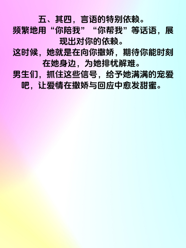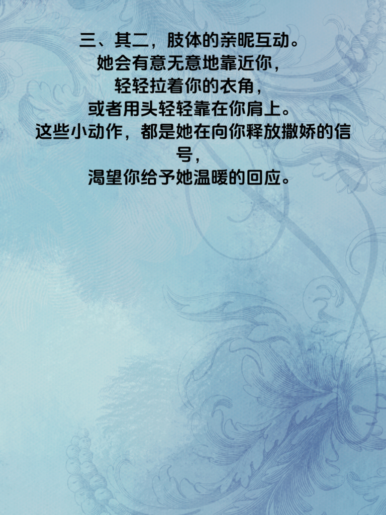 一、在爱情的甜蜜乐章中,女生的撒娇宛如灵动的音符,传递着独特的情感信号。男生们,若想与心仪的她奏响更美妙的恋曲,就需敏锐捕捉这些信号。 二、其一,语气的娇柔婉转。当她与你说话时,声音不自觉地变得轻柔、软糯,那便是撒娇的前奏。比如,她可能会轻声说:“人家真的好想吃那个嘛。”这看似简单的话语,实则是她渴望你关注与满足她小愿望的暗示。 三、其二,肢体的亲昵互动。她会有意无意地靠近你,轻轻拉着你的衣角,或者用头轻轻靠在你肩上。这些小动作,都是她在向你释放撒娇的信号,渴望你给予她温暖的回应。 四、其三,表情的娇嗔可爱。微微嘟起的小嘴,略带委屈的眼神,都是她撒娇的标志。也许只是因为你晚回了消息,她就会露出这般神情,让你心生怜惜。 五、其四,言语的特别依赖。频繁地用“你陪我”“你帮我”等话语,展现出对你的依赖。这时候,她就是在向你撒娇,期待你能时刻在她身边,为她排忧解难。男生们,抓住这些信号,给予她满满的宠爱吧,让爱情在撒娇与回应中愈发甜蜜。