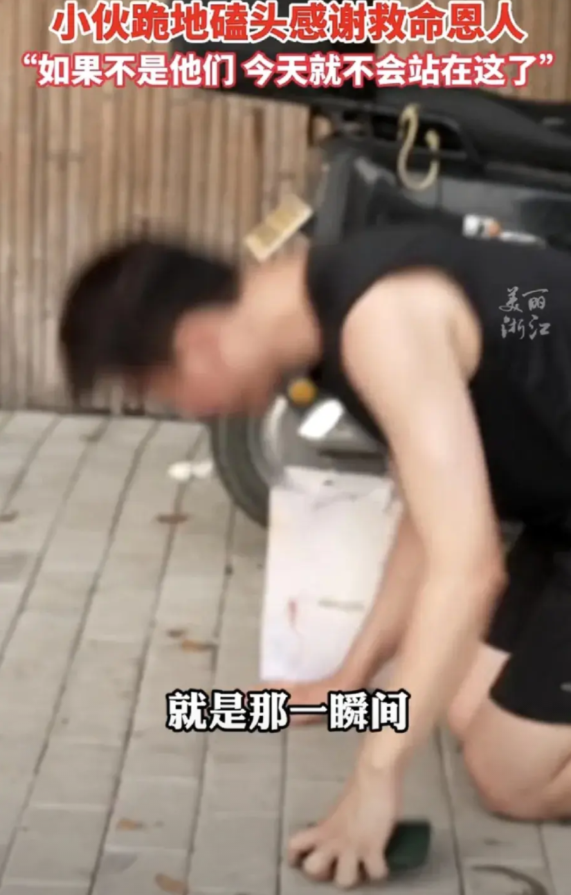 事后小伙表示,在两位好心大哥看来这是举手之劳的小事,但是小伙觉得这是他的生死瞬间,如果当时不是他们,自己就不会站在这了!所以必须磕一个谢谢他们!