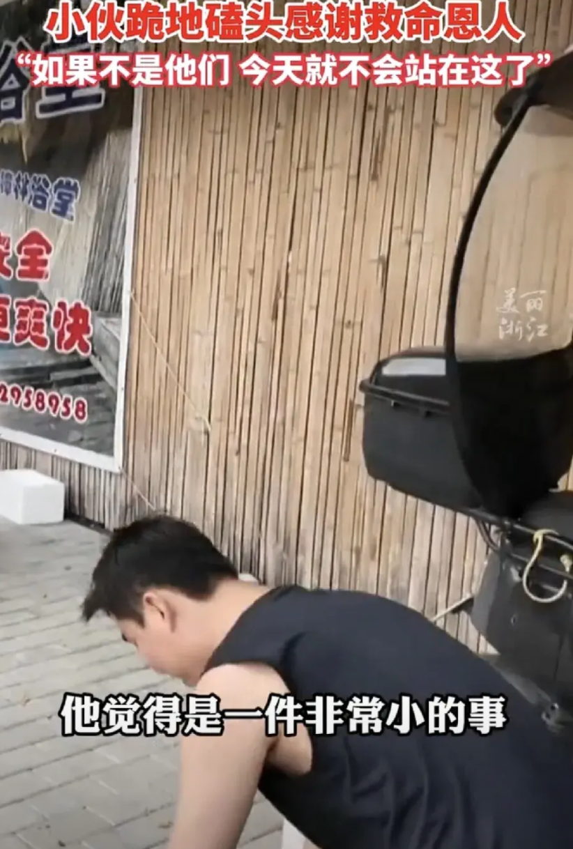吉林一小伙到杭州游玩时不慎溺水,期间两位萧山大哥发现小伙在水中挣扎呼救后,则毫不犹豫的立即下水救起了小伙。可两位大哥在确认小伙没事后,准备离开之时,小伙竟叫住两位大哥,并立即跪地磕头感谢他们的救命之恩。