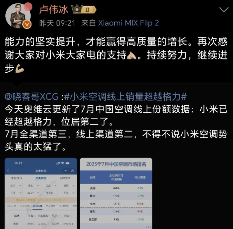 格力和小米到底谁空调领先?卢伟冰说小米,格力高管说格力,两家说法不一样。