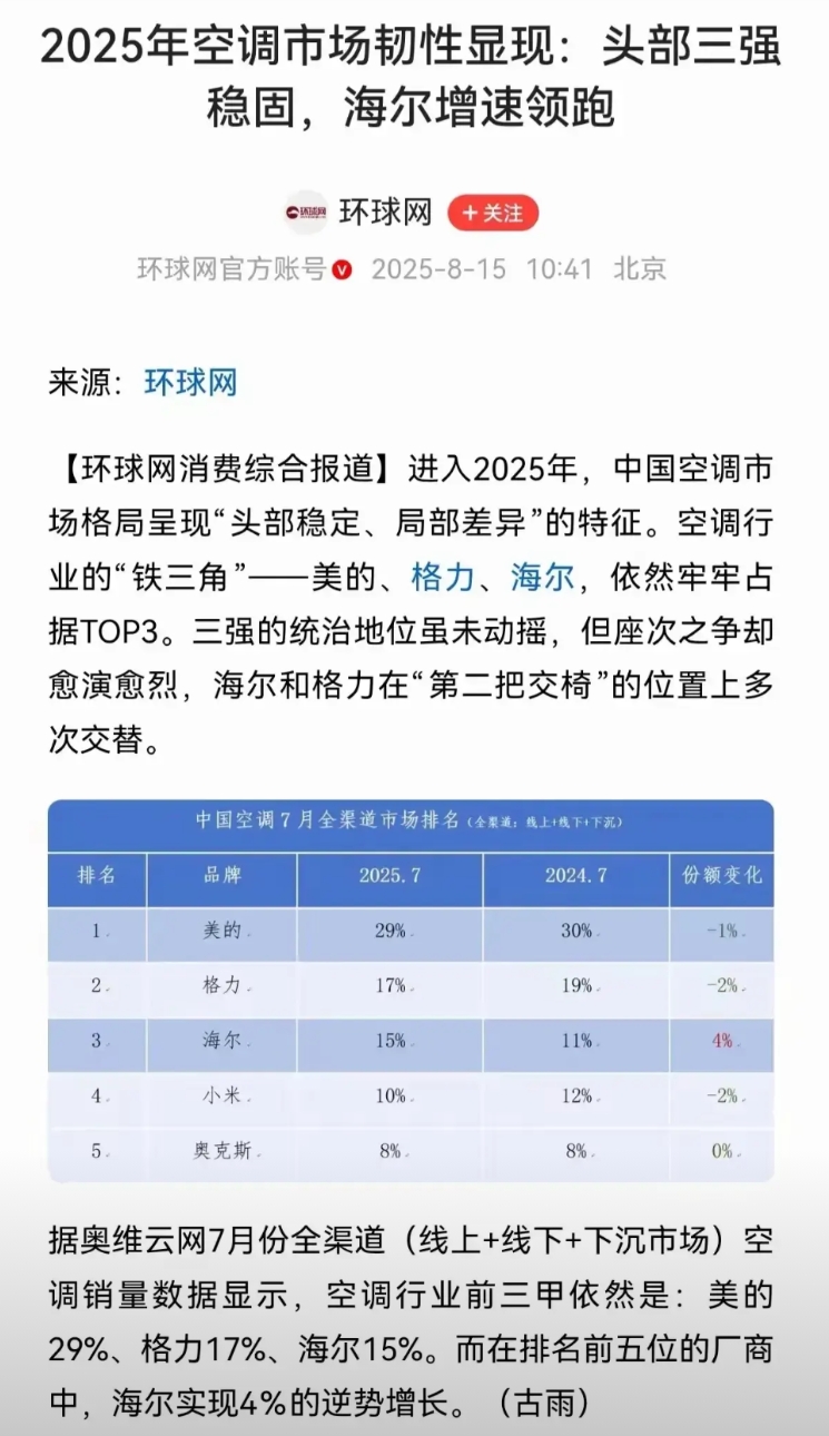 我们一起来看两家的数据来源,卢伟冰转发的数据来源是权威机构,具体是哪家机构,我也不清楚。格力的数据来自奥维云网,官媒环球网也基于这个数据进行转发。