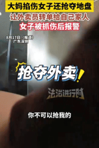 缺大德了!”广东深圳,一外卖员到写字楼送餐时,觉得等电梯耽误时间,就给女子钱,让其帮忙代送到顾客手里,没想到,旁边的大妈看到后,竟从女子手里抢单,并抓伤女子,让外卖员转单给自己家人,网友:这不就是强买强卖? 据法治进行时8月17日消息,女子在家闲着无聊,就到附近写字楼等外卖员的到来,送餐高峰期,外卖员手里有非常多的单子,写字楼的楼层既高,电梯还少,很容易就超时了。 一单超时,就会连带着后面的单子超时,于是就有了“外卖代送”这个行业,这群人挣得就是外卖员的钱,他们的主要任务就是,拿着饭乘坐电梯或者爬楼梯,在规定时间把饭给顾客。 女子就是干代送的,虽然挣得不多,但胜在自由,外卖员急匆匆跑到大厅,把钱和餐同时给到了女子,并说了顾客所在的楼层和门牌号,女子准备去送时,却遭到了大妈的阻拦。 大妈也是代送,甚至干的时间比女子还早,可她年纪大了,外卖员也不敢让大妈送,万一送餐途中出点啥事,讹上他们这么办,女子向大妈强调,她和外卖员已经完成交易。 钱都给过了,让大妈等待其他外卖员,但大妈不依不饶,执意要抢夺餐食,外卖员见状,挡在女子身前,希望大妈能讲讲道理,总不能强买强卖吧。 但大妈根本顾不得那么多,甚至还觉得是女子抢了她的生意,抓的女子胳膊上全是伤口,女子还不敢还手,餐是送不成了,女子直接报警,让民警介入,送个餐还真把写字楼当自己家了。 对于这件事情,大家有什么看法?