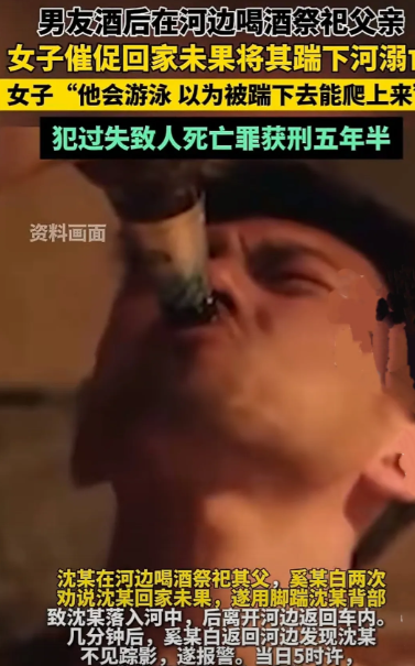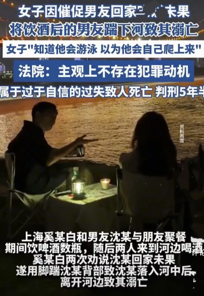上海,女子与朋友聚餐喝了不少酒,中途男友来找她,加入聚餐继续喝酒,而后又去大排档吃烧烤又喝,朋友散去后,情侣两人带着酒来到河边,男友喝酒祭奠其父,女子2次劝他回家未果,一来气从后背踹了他一脚,男友掉入河中,可女子头也未回地回到车内,几分钟后,她见男友没回来便返回,未见男友踪影报警,而两人从此天人永别!女子:没想过他会死,以为他会自己爬上来!法院这样判的! 据极目新闻8月15日发布,李芳(化名)和男友感情十分好,马上就要谈婚论嫁。可她没想到,一次聚餐过后,因为自己冲动的一次行为,竟然让男友永远离开了她! 李芳和朋友们好久不见,于是几人约在一家热闹的餐厅聚餐,推杯换盏间,几瓶啤酒下肚,她的脸颊也泛起了红晕,男友给她发消息,因为害怕她喝多自己无法回家,就说来接她回家。 几人正聊得兴起时,男友找了过来,看到女友和朋友们玩得开心,还没有想结束的意思,他也没多说什么,顺势加入了聚餐。李芳男友一来,聚餐的氛围更热闹了。李芳向朋友们大大方方的介绍了男友,还说俩人最近有结婚的打算。 男友和的朋友们熟络以后,就开始碰杯然后聊天,啤酒一瓶接一瓶地开。 李芳看着男友,没去阻止,只是偶尔笑着劝他少喝点。大家聊工作然后聊生活,又聊起来俩人结婚的事情,大家十分高兴,催促着他们赶紧结婚,准备吃席去。 不知不觉,餐厅里的人渐渐少了,几人也喝的都差不多了,一看时间不早,朋友们都打算回去。可李芳男友觉得还没尽兴,拉着李芳和朋友们又去了附近的大排档。大排档里烟火气十足,几人又点了些烤串和啤酒。边说话边喝又喝了不少。 一直喝到大排档也要打烊了,朋友几个也都已经醉倒了,等到清醒一点后,朋友几人散去。李芳和男友两人带着没喝完的酒,晃晃悠悠地来到了河边。俩人在河边说话,本应是能让人放松的地方。可男友醉意上头,不免想起了自己去世多年的父亲。 他拿着酒,坐在河边,默默地喝着,说是要祭奠父亲。李芳看着男友沉浸在自己的情绪里,害怕他心里难过,加上喝了酒,脑子也不是很清醒,就想着赶紧回家。她劝了男友两次,让他别在河边待着了,跟自己回去。 可男友像是没听到一样,还是坐在那里,拿着酒瓶,一口一口地喝着。之后李芳又催促男友,但男友让他先去车里等候,自己喝完就去找她。李芳一下子就来了气,酒精上头,再加上她觉得男友太不把自己的话当回事了。 她想起来男友会游泳,于是就走到男友身后,朝着他的后背就踹了一脚。男友毫无防备,“扑通” 一声掉进了河里。男友掉进河里后,李芳没想着等他上来,而是故意想给他个教训,于是头也不回的走到车上。 结果李芳在车上等了好久,都不见男友回来,此时自己的酒劲也醒了点她心里七上八下的,就回到河边去寻找男友,可连一点人影都没看到!打电话发短信都没人接,她心里慌了,不会自己男友根本就没从水里上来吧! 平复好心情后,李芳赶紧报了警。警察到了现场后,展开了搜救。可最终,还是在河里找到了男友的遗体。因为一次冲动,本该有幸福未来的俩人,就这样天人永隔! 法院审理后认为,李芳主观上不存在犯罪动机,属于过于自信的过失致人死亡,最终判处她有期徒刑五年六个月。 对此你怎么看?欢迎大家在评论区留言讨论。