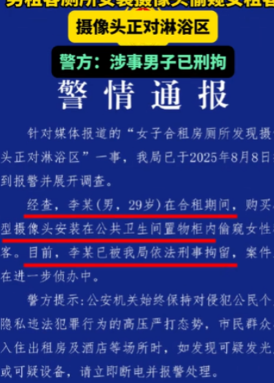 “解释不清了!”西安,小伙去姐姐出租房洗澡,不料,竟然在卫生间抽屉里,发现了一个摄像头,而且正对着淋浴区,这个摄像头可以不联网,不插内存卡,小伙告诉姐姐后,姐姐怀疑不是房东就是室友干的,果断选择了报警!警方:已经立案正在调查! 据8月17日都市报道发布,在西安的一间看似普通的合租房里,一名年轻人准备洗澡时,无意间发现卫生间抽屉上有一个孔洞。