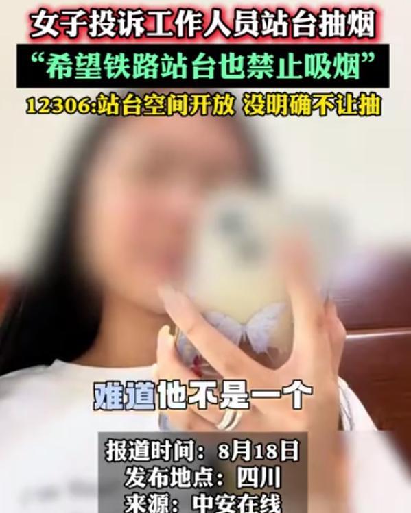 管的也太宽了!四川,一女子乘坐高铁,下车后就发现一名穿着制服的工作人员在站台上抽烟,女子拍下来后就打电话将其进行了举报,不过12306方面回应:没有明确规定不让抽烟!网友:她应该去投诉烟草 视频中,女子一边打电话进行投诉,一边将其录音拍视频,她表示自己在乘坐高铁时,看到一名穿着铁路制服的工作人员在站台上抽烟,根据她了解的条例,这应该是不被允许的,所以他想要投诉 客服那边反问道:你知道他的工号吗?他是在工作状态吗? 女子:她应该是在工作状态,但我不确定是车上的还是站台的,但他确实是铁路的 客服:也就是说你不确定他是工作状态,那不好意思,我们这边没法记录,因为他也可能是下班,不见得在站台上就都是上班的工作人员,只要不是密闭的站台,现在并没有明确规定不让抽烟 对此,女子依旧没放弃,表示即便如此,也希望能够反馈一下,希望高铁的站台上能够禁止吸烟 这里就有一个问题了,站台抽烟到底行不行? 其实目前规定确实主要针对车厢和密闭区域,像高铁上抽烟会触发警报。但开放式站台并没有相关规定,尤其很多老车站设计时就有吸烟区 从女子的描述来看,这事管得有点宽了。就像有人在路边抽根烟,如果不是在室内、不是在禁止区域,其实法律也没规定不可以。工作人员虽然穿着制服,但也可能刚下班,抽根烟解解乏,并不是什么大事。把这种事当成严重投诉来处理,多少有点吹毛求疵 有时候,问题不在于抽烟,而在于大家的心态。过度上纲,容易让生活变得紧绷