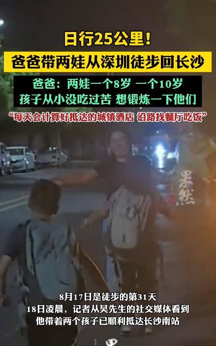 “这就是有钱任性吗?”近日,湖南一男子带着放暑假的儿女步行回老家,历时31天,三人一路从深圳,走到了长沙南站,行走超过800公里!男子规定每天的花销在400元左右,超出的就要用孩子的压岁钱来补,一个月下来,孩子们学会了节约、与商家沟通和砍价等技巧。网友:没苦硬吃! 如今很多家长都十分宠溺孩子,生怕他们吃一点苦、受一点罪,殊不知,这样是不利于孩子的成长的。所以一些开明的家长,会用非常规的方法来锻炼孩子的意志。 据了解,吴先生在深圳工作,孩子们放暑假后,他便打算带着孩子回老家,顺道锻炼锻炼他们,尤其是小儿子,做事情经常半途而废。 7月11日,吴先生和孩子们收拾好行李后就开始出发了,当天三人就走了20多公里,结果吴先生突然接到公司的电话,需要回去处理事情,于是三人就先回去了。 7月17日下午,吴先生安排完公司的事情后,就打车带着孩子回到了之前返回的地方,从7月18日开始,三人开始按照计划行进,例如每天至少要走23公里,在广东一天不能花超450元,在湖南一天不能花超400元等。 一开始,儿子花钱还大手大脚的,吃饭要点好几个菜,路上还要买大量零食吃,每天的支出基本都是超标的,后来,儿子学会了节约,每一块钱都要认真思考。 经过31天的长途跋涉,三人最终抵达了长沙南站,成功和妻子汇合,然后回到了老家。 妻子对孩子的成长非常欣慰,没想到他们真的坚持了下来。大家对于这件事是怎么看? 信息来源:《31天,800多公里!爸爸带两娃从深圳徒步到长沙:孩子没吃过苦,想锻炼一下!》新民晚报