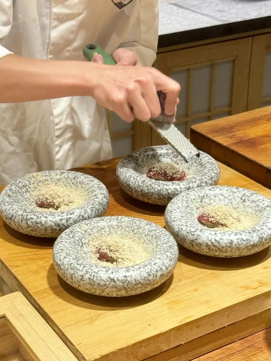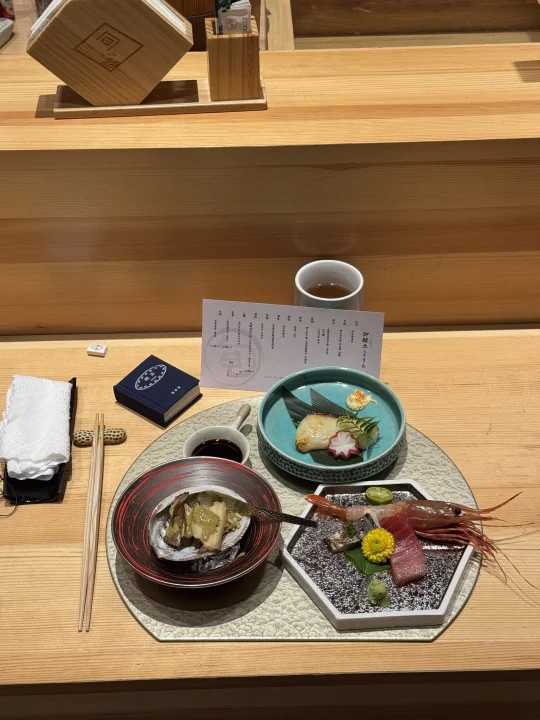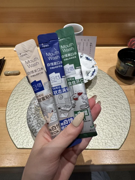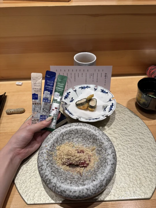 近期吃到坠满意的一顿!! 坐在板前一边看师傅亲手制作一边看日剧也太治愈了 食材和服务也好棒!体验感拉满了! 金枪鱼、生蚝🦪、鹅肝、天妇罗… 每口都有惊喜 吃完觉得好幸福🤤 他们家的寿司🍣是开盲盒的 很有趣 味道也不错 饭后冰淇淋🍨让我还蛮惊喜的 草莓味的带点酸🍓 清爽又解腻 吃完用白惜漱口水漱个口特别的清新~ 很方便携带 离开前还顺带了几包走🤣 已经打算和朋友来二刷了!