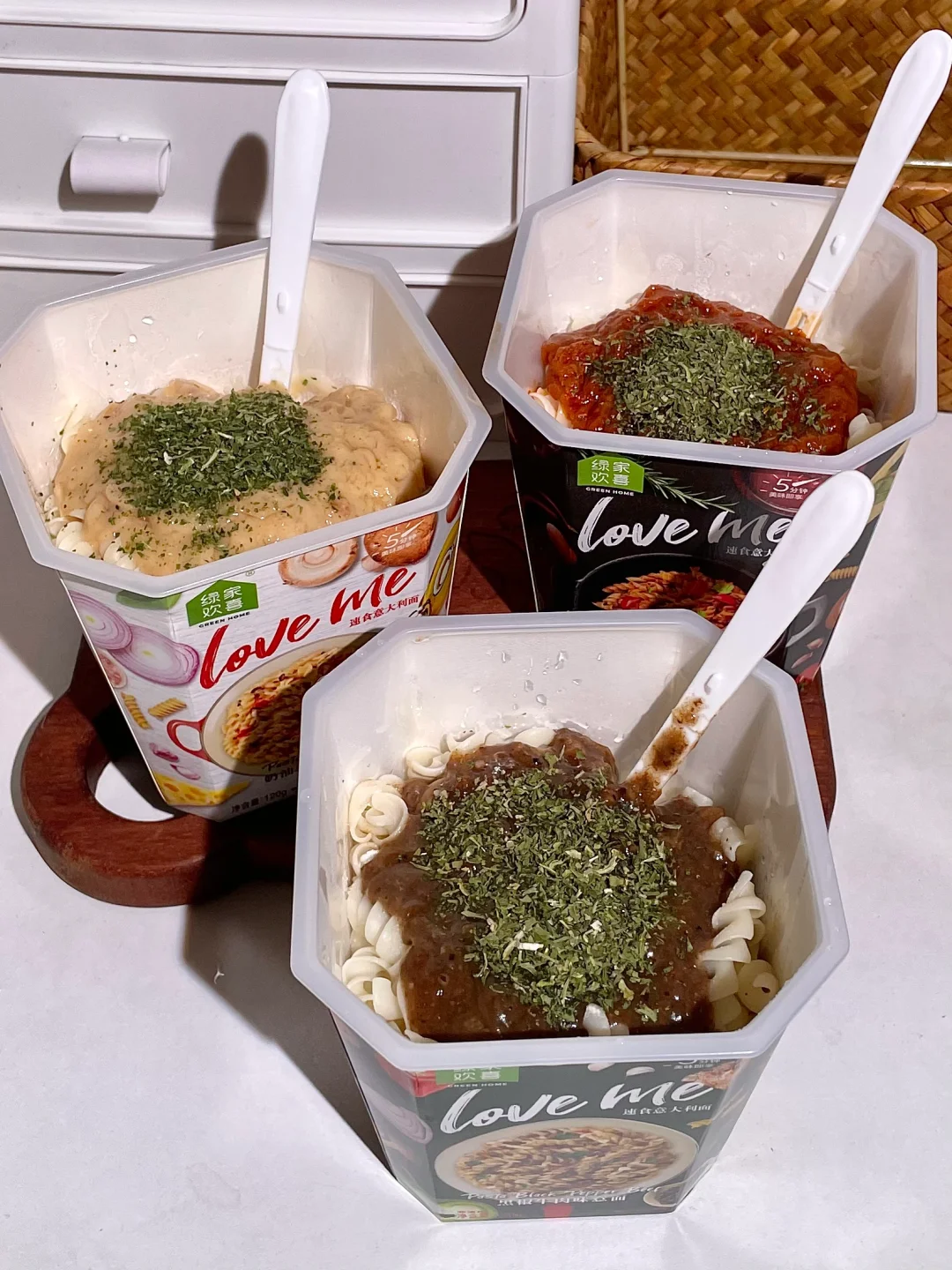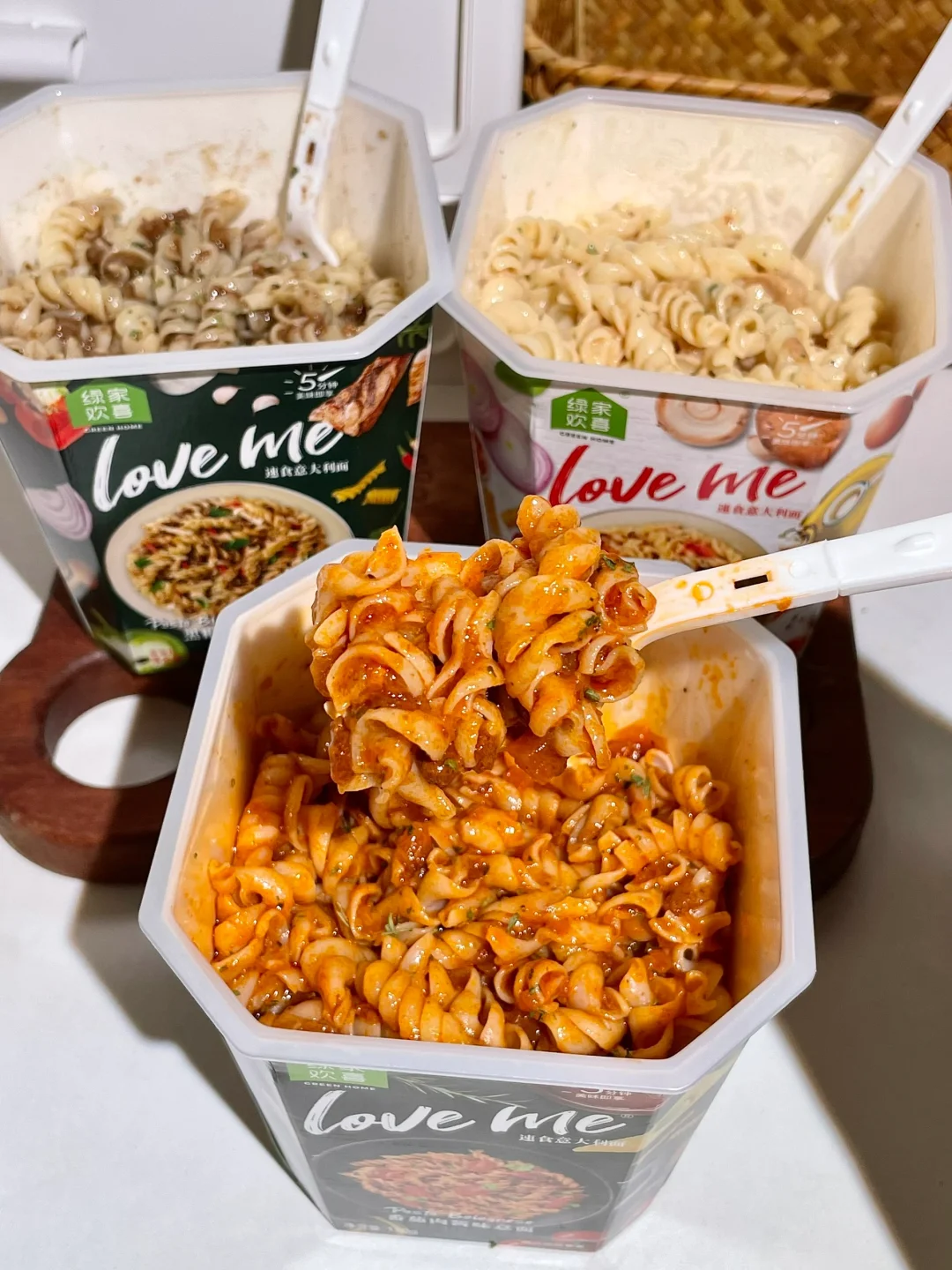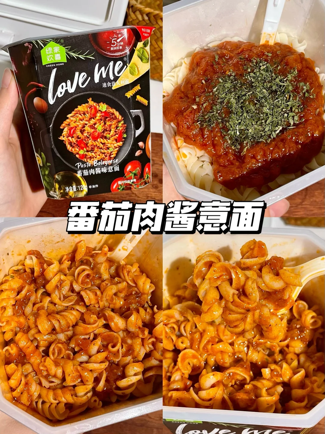 在家五分钟吃到西餐厅水平的意面! love me你真的有点东西!!! 三种风味:番茄肉酱/奶油培根/黑椒牛肉 🍅番茄肉酱 超浓番茄味!还有番茄颗粒!口感老丰富了!酸酸甜甜的,超经典的口味!小朋友也很爱! 🥓奶油培根 每次去西餐厅都会点!没想到在家吃的一点不输外面的!芝士🧀奶酱裹满每一根意面!还有培根在里面! 🐂黑椒牛肉 这个口味也是经典不出错的!黑胡椒搭配牛肉,百吃不腻!低GI的意面吃起来无负担! 意面口感爽滑Q弹!饱腹感十足! 而且自带配料还有叉子,吃完还不用洗碗,解放双手超方便!!