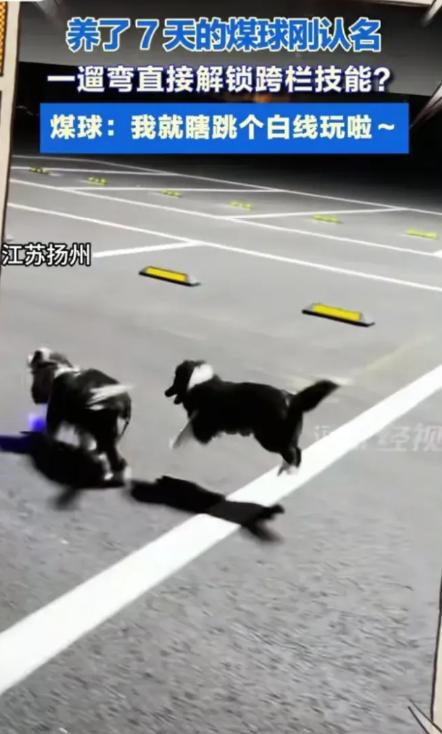 8月18日,江苏扬州。网友发视频表示,养了一星期的小狗会跳地上画的一根根白线,感觉特别好笑。不少人觉得这只狗聪明会跳栏杆,其实这只狗有点呆呆傻傻的。