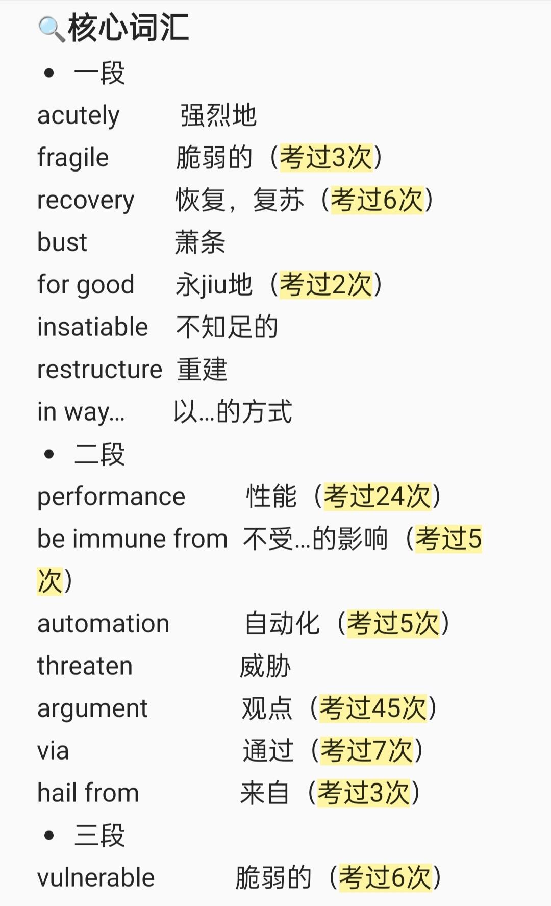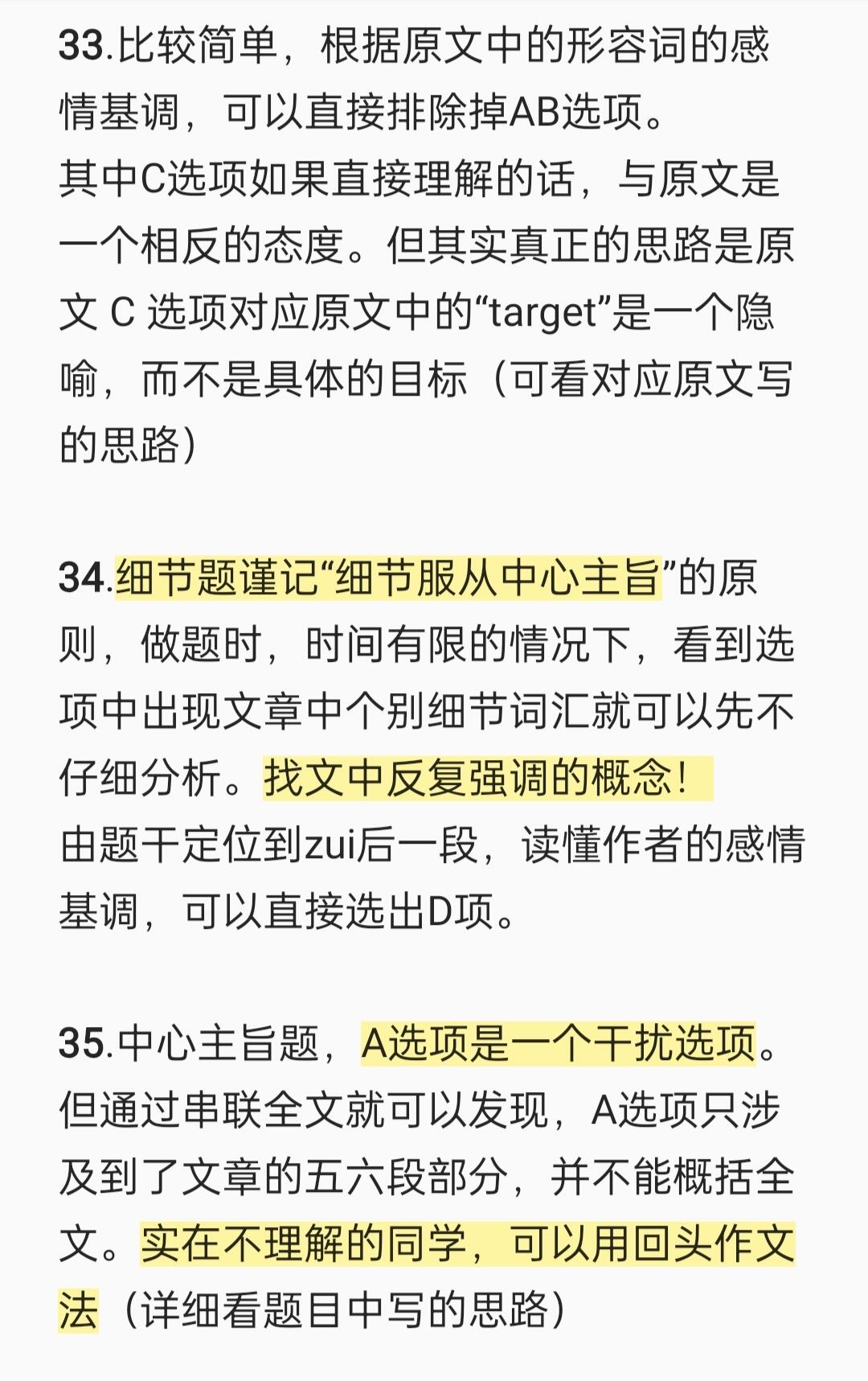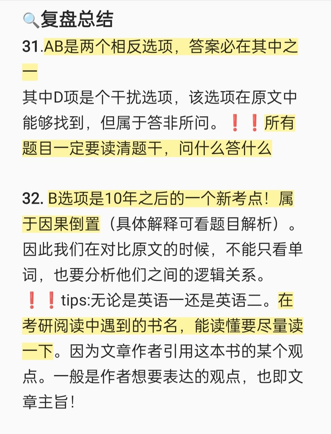 🔍核心词汇 📖一段 acutely         强烈地 fragile          脆弱的(考过3次) recovery      恢复,复苏(考过6次) bust             萧条 for good      永jiu地(考过2次) insatiable    不知足的 restructure  重建 in way…       以…的方式 📖二段 performance         性能(考过24次) be immune from  不受…的影响(考过5次) automation           自动化(考过5次) threaten                威胁 argument              观点(考过45次) via                          通过(考过7次) hail from               来自(考过3次) 📖三段 vulnerable            脆弱的(考过6次) 📖四段 tightly scripted    高度模式化 initiative               主动性(考过8次) 🌷字数限制,写不下啦,详细看图 —— 🔍复盘总结 31.AB是两个相反选项,答案必在其中之一 其中D项是个干扰选项,该选项在原文中能够找到,但属于答非所问。❗❗所有题目一定要读清题干,问什么答什么 32. B选项是10年之后的一个新考点!属于因果倒置(具体解释可看题目解析)。因此我们在对比原文的时候,不能只看单词,也要分析他们之间的逻辑关系。 ❗❗tips:无论是英语一还是英语二。在考研阅读中遇到的书名,能读懂要尽量读一下。因为文章作者引用这本书的某个观点。一般是作者想要表达的观点,也即文章主旨! 33.比较简单,根据原文中的形容词的感情基调,可以直接排除掉AB选项。 其中C选项如果直接理解的话,与原文是一个相反的态度。但其实真正的思路是原文 C 选项对应原文中的“target”是一个隐喻,而不是具体的目标(可看对应原文写的思路) 34.细节题谨记“细节服从中心主旨”的原则,做题时,时间有限的情况下,看到选项中出现文章中个别细节词汇就可以先不仔细分析。找文中反复强调的概念! 由题干定位到zui后一段,读懂作者的感情基调,可以直接选出D项。 35.中心主旨题,A选项是一个干扰选项。但通过串联全文就可以发现,A选项只涉及到了文章的五六段部分,并不能概括全文。实在不理解的同学,可以用回头作文法(详细看题目中写的思路)