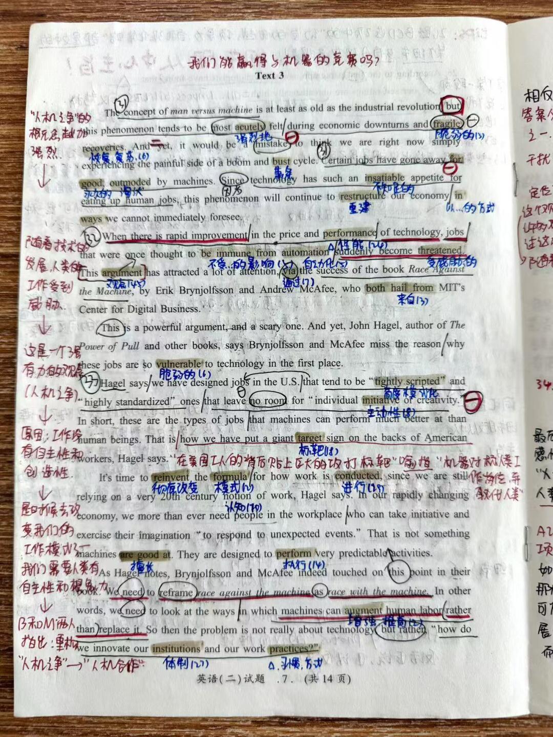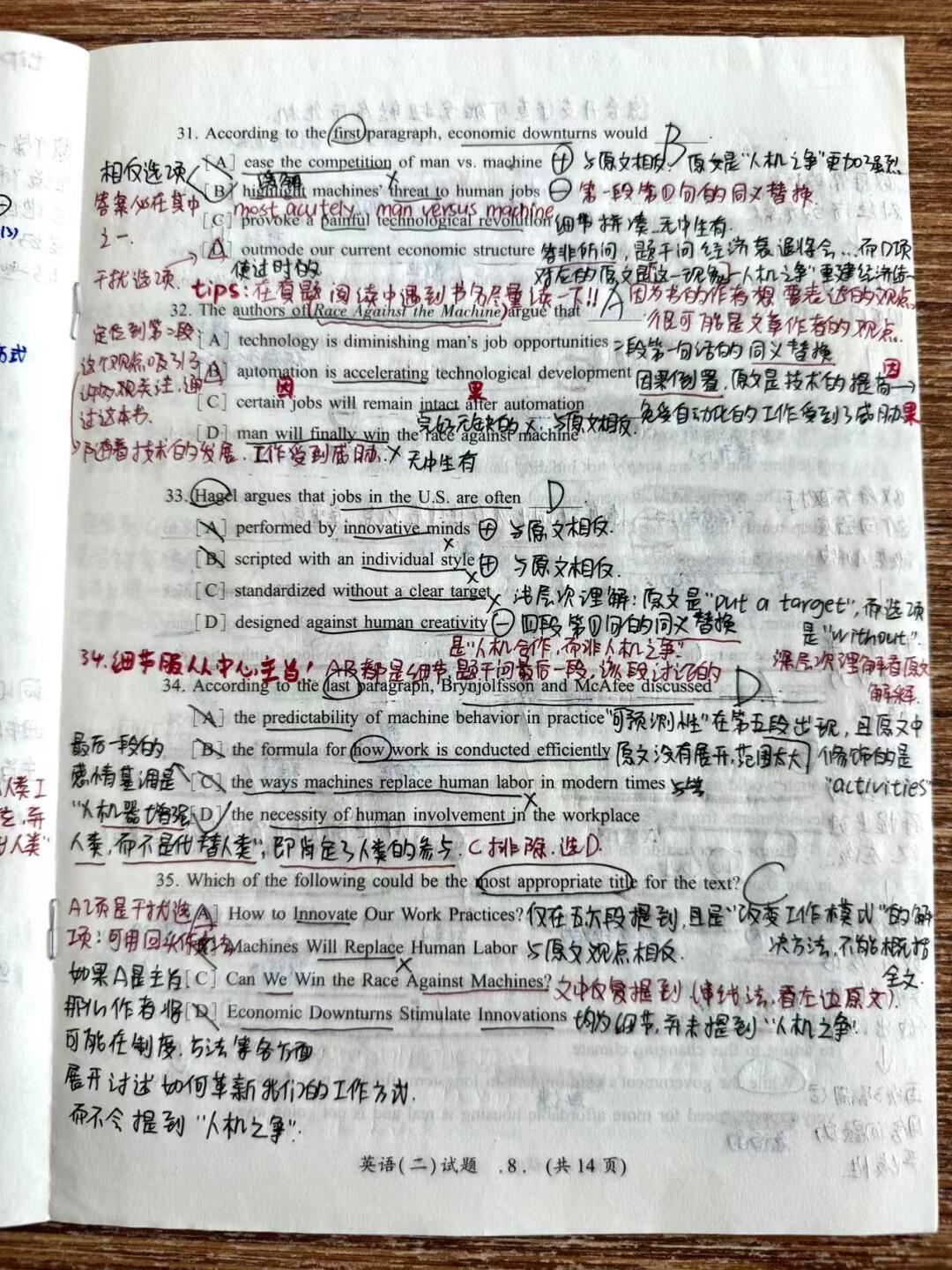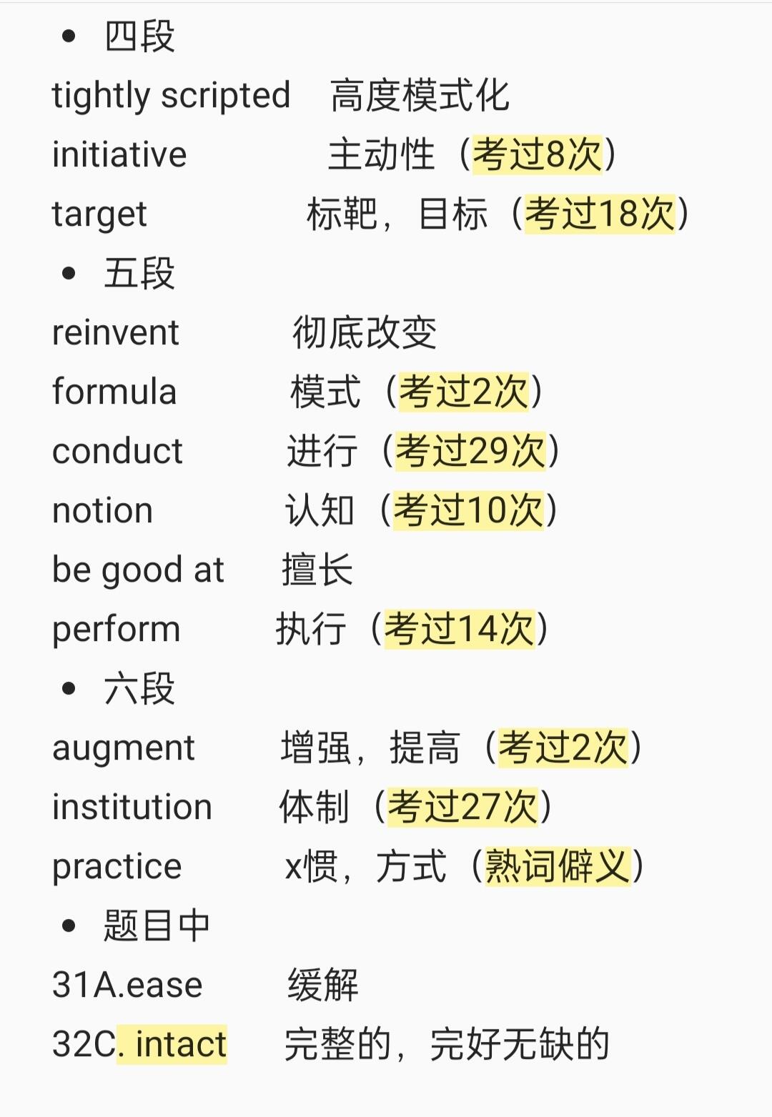 🔍核心词汇 📖一段 acutely         强烈地 fragile          脆弱的(考过3次) recovery      恢复,复苏(考过6次) bust             萧条 for good      永jiu地(考过2次) insatiable    不知足的 restructure  重建 in way…       以…的方式 📖二段 performance         性能(考过24次) be immune from  不受…的影响(考过5次) automation           自动化(考过5次) threaten                威胁 argument              观点(考过45次) via                          通过(考过7次) hail from               来自(考过3次) 📖三段 vulnerable            脆弱的(考过6次) 📖四段 tightly scripted    高度模式化 initiative               主动性(考过8次) 🌷字数限制,写不下啦,详细看图 —— 🔍复盘总结 31.AB是两个相反选项,答案必在其中之一 其中D项是个干扰选项,该选项在原文中能够找到,但属于答非所问。❗❗所有题目一定要读清题干,问什么答什么 32. B选项是10年之后的一个新考点!属于因果倒置(具体解释可看题目解析)。因此我们在对比原文的时候,不能只看单词,也要分析他们之间的逻辑关系。 ❗❗tips:无论是英语一还是英语二。在考研阅读中遇到的书名,能读懂要尽量读一下。因为文章作者引用这本书的某个观点。一般是作者想要表达的观点,也即文章主旨! 33.比较简单,根据原文中的形容词的感情基调,可以直接排除掉AB选项。 其中C选项如果直接理解的话,与原文是一个相反的态度。但其实真正的思路是原文 C 选项对应原文中的“target”是一个隐喻,而不是具体的目标(可看对应原文写的思路) 34.细节题谨记“细节服从中心主旨”的原则,做题时,时间有限的情况下,看到选项中出现文章中个别细节词汇就可以先不仔细分析。找文中反复强调的概念! 由题干定位到zui后一段,读懂作者的感情基调,可以直接选出D项。 35.中心主旨题,A选项是一个干扰选项。但通过串联全文就可以发现,A选项只涉及到了文章的五六段部分,并不能概括全文。实在不理解的同学,可以用回头作文法(详细看题目中写的思路)