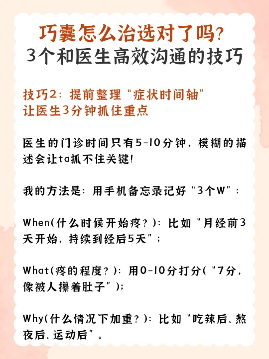 很多姐妹复诊时只会说:“我巧囊疼,怎么办?”但医生的门诊时间只有5-10分钟,模糊的描述会让ta抓不住关键!