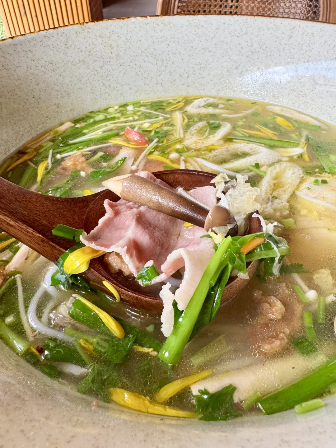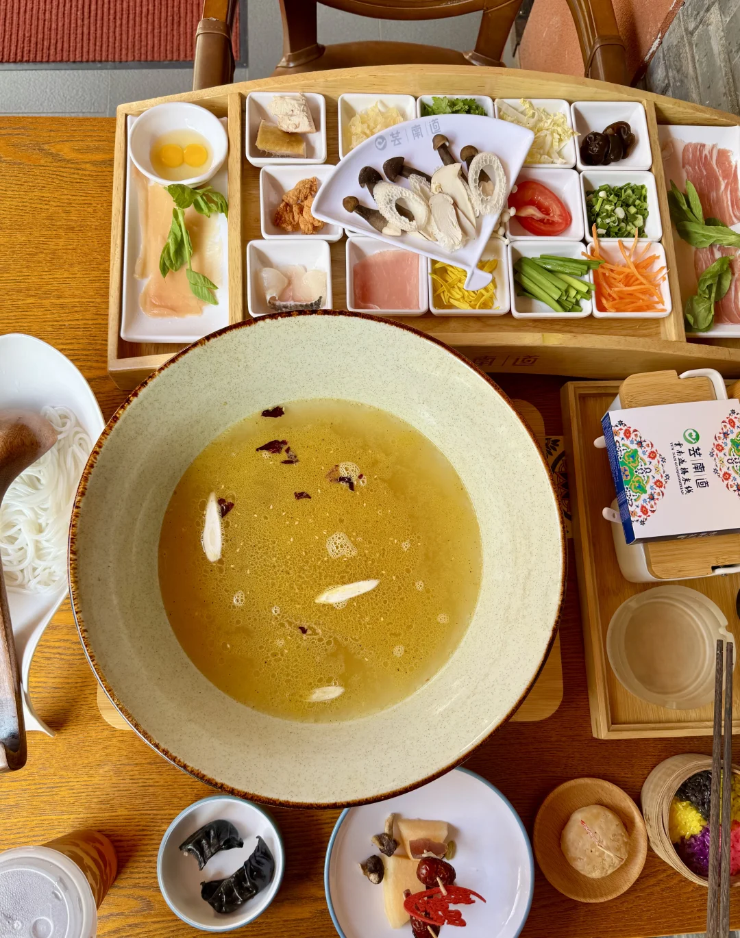 上周参加食菌季名人悦享会,被种草野生菌过桥米线,转头就来尝了。90/份,汤鲜味美,作为过桥米线无可挑剔。加上配了诺邓火腿和鲜花饼,云南风味拉满,这一点很得人心🍜💐但是菌子配的主要是竹荪、黑皮鸡枞,两样都是人工,服务员说还有松茸,小到我差点就没发现~这这这