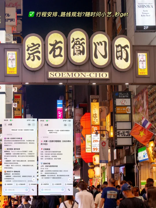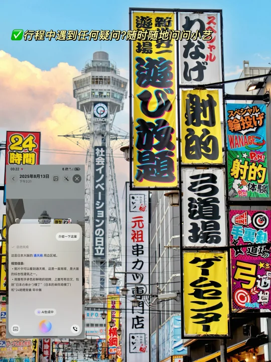 ✅行程安排、路线规划怎么玩?随时随地问问小艺“大阪一日游精华路线推荐”,历史、美食、夜景全体验