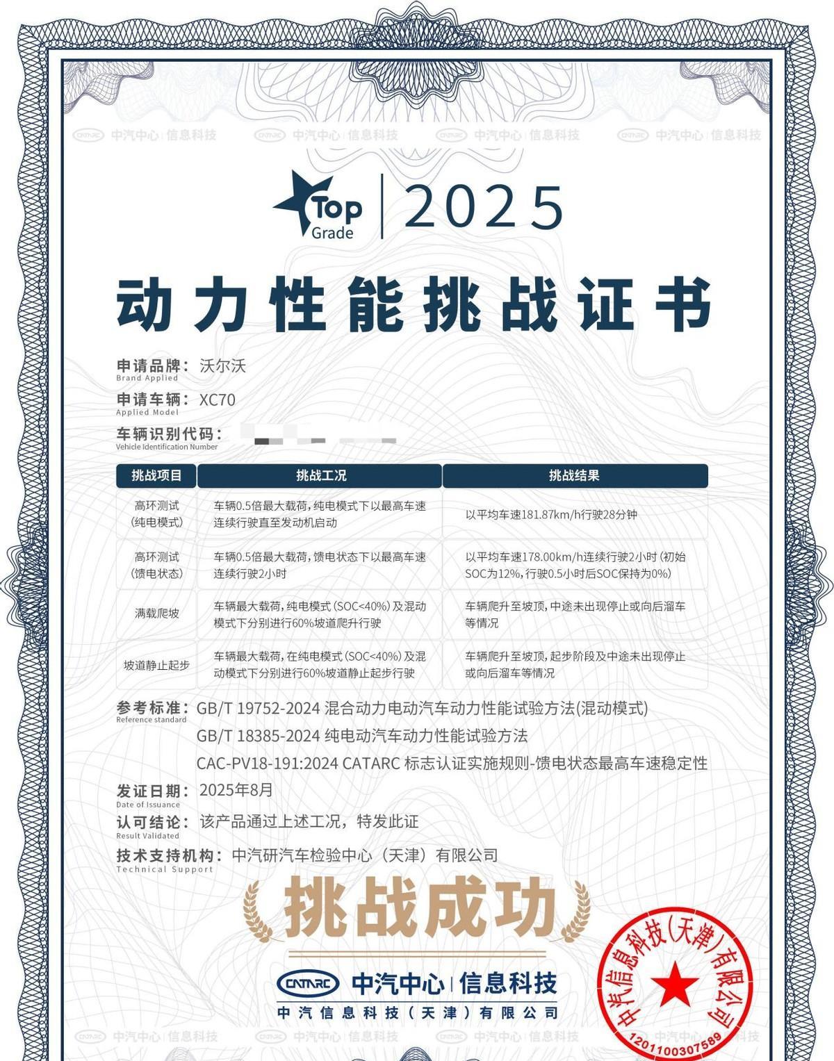 豪华超混第一车?全新XC70用中汽研测试成绩证明自己确实面面俱到! 如何才能满足用户对续航、动力以及安全的全方位需求?基于SMA架构打造的全新XC70选择通过中汽研这一权威机构的测试结果来证明自己,就是这么一款具备真正电感化体验和全工况性能的长续航超混豪华SUV。 先以高环测试为例,中汽研对全新XC70纯电和馈电状态下的高速表现进行观测,最终得到纯电状态下平均车速181.9km/h行驶28分钟,且电量降至12%时自动切换混动模式,继续保持180km/h稳定行驶的成绩。而馈电状态下,全新XC70以178km/h的平均车速行驶2小时,其中1.5小时处于电量为0%的极度亏电,一举打破多数消费者对纯电车高速无力的固有认知。 再就是全域续航测试,全新XC70纯电续航最终实测结果为278.2km,这意味着多数用户日常一周通勤所需皆可满足,经济性与纯电动车型无异。而综合续航里程则是1585.7km,一口气可从北京直达上海。关键是测试路段有着复杂路况,涵盖高海拔和温差大等不同地区的不同气候带,因此在用户实际用车场景下,该车的续航能力只会更出色。 对了,全新XC70还进行满载爬坡测试,在混动模式、纯电模式(SOC<40%)下均能流畅攀爬至60%陡坡坡顶,包括在坡道上静止起步也无溜车现象,证明了“豪华超混第一车”的实力,想买台面面俱到的豪华插混SUV,可以留意一下全新XC70。