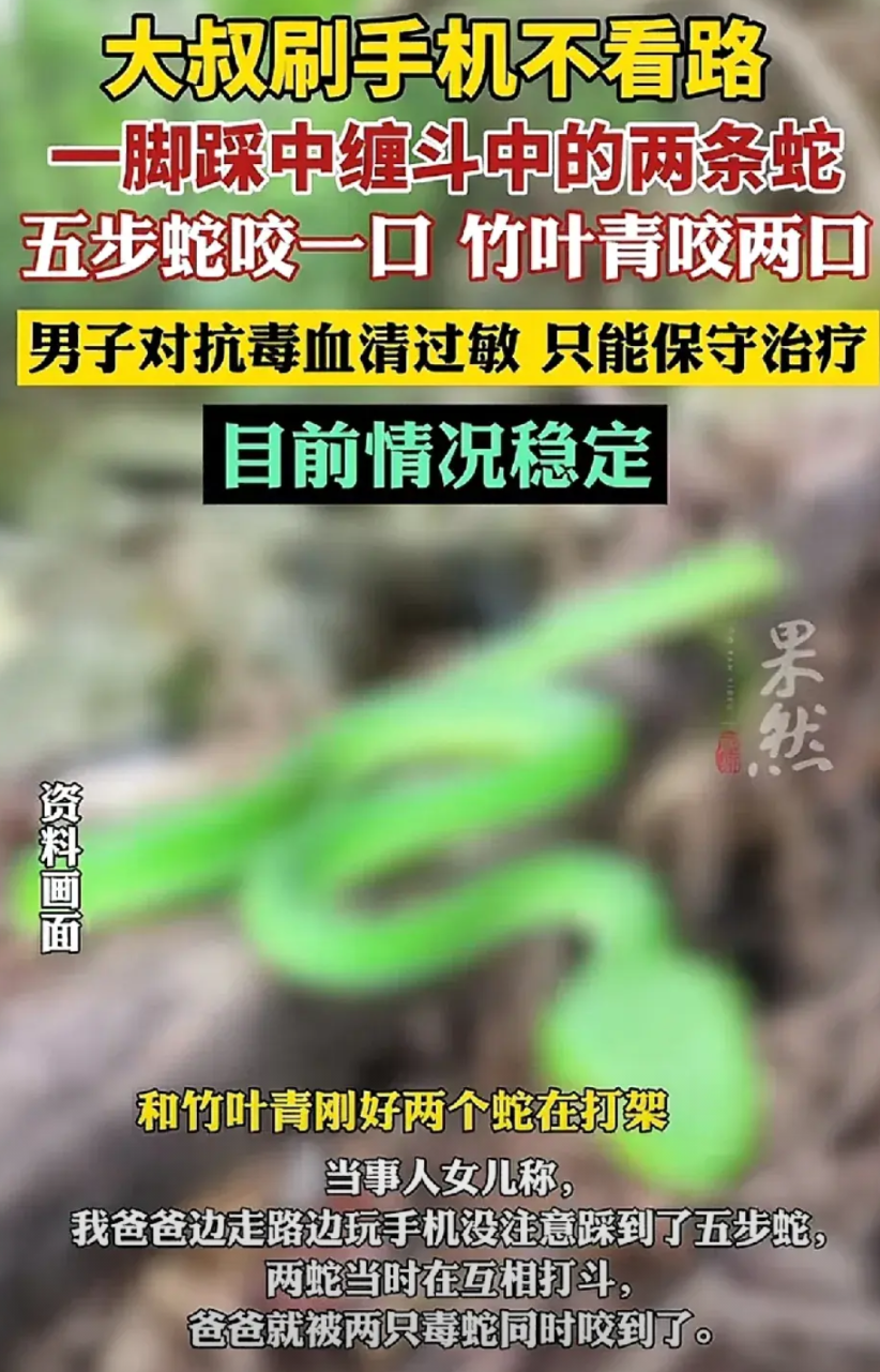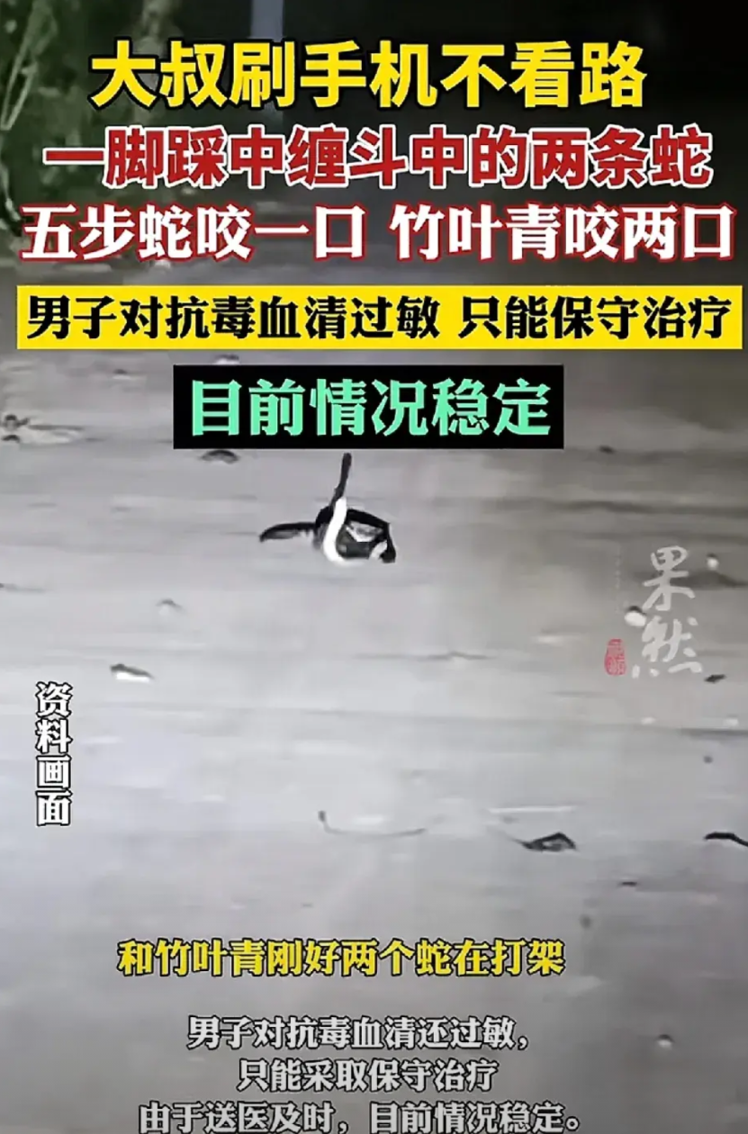 安徽乡村的傍晚,男子一边散步,一边看手机,不小心踩到了正在路边缠斗的两条蛇。五步蛇先咬了男子一口,竹叶青也紧接着咬了男子两口。