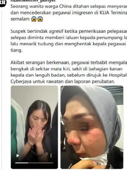 “都是脾气惹的祸!”8月中旬,中国游客在吉隆坡机场突然发飙,竟当众扯下女性官员头巾,猛撞柱子!两个孩子目睹母亲疯狂施暴全过程,受伤官员满脸部头部受伤!女子或将迎来罚款或者监禁。 8月13日,吉隆坡机场发生了一件令人匪夷所思的事,就在大家都排队进行检查时,这时一名中国女子和另一名成人以及两名儿童引起了负责检查的移民官的注意。移民官发现这一行人在入境系统中没有任何记录,就提出让这一行人先行出来,等待上级的进一步检查。 就在这时移民官不知道哪句话引起了女子的不满,女子竟然瞬间怒不可遏,对移民官进行谩骂,不仅如此,她还伸手朝着移民官的头巾拽去,甚至还把移民官的头撞向旁边的柱子上。 见此状况机场立即呼叫航空安全组的到来,没想到女子仍然十分嚣张,执意不肯配合执法,直到最后才被马来西亚皇家警察局带走。而此时的移民官早就因为女子的大打出手而鼻青脸肿,送进医院治疗。 回忆起当时那一刻,周围的旅客都表示非常震惊,女子当时好像很着了魔,不顾一切地将移民官的头撞向柱子,别说周围人看着害怕,就算是她的两个孩子估计也收到不小的惊吓,整个柜台的人员都被震惊的说不出话来。之后警方到场记录了在场的五名证人的陈述,想起当时的场景,他们仍然不寒而栗。 就在8月18号,女子的身份被公开,根据马来西亚的刑法,,这名女子被罚一个月监禁和2000令吉,但是在法庭上她不停辩解当天的事情是一个误会,并且希望能够从轻处罚,但法官并不会轻易相信她,每个人都应该为自己的行为付出应有的责任。 之后这位女子的律师以她还有两个孩子和丈夫,一个一岁半一个五岁,声称这三人完全依赖女子,请求减轻刑罚。不得不说,当时在机场航站楼谩骂痛打的时候没有想起孩子,等到刑罚出来,又以孩子为借口来请求减少刑罚,女子的律师这是法律上说不过去了就又开始走情理这条路了。 先不说这名女子是一位母亲,按理说更应该注意自己的言行举止,就单单是随意打人这种行为,也是让常人难以理解的,况且对于本就是穆斯林的移民官来说,头巾被扯下本就是极大的侮辱,可以说这名女子不仅违反法律,也触碰了宗教文化的底线。 事情一经披露,迅速引起广大网友的激烈讨论,不少网友都认为应该对该女子从重处罚以儆效尤。对此大家怎么看?