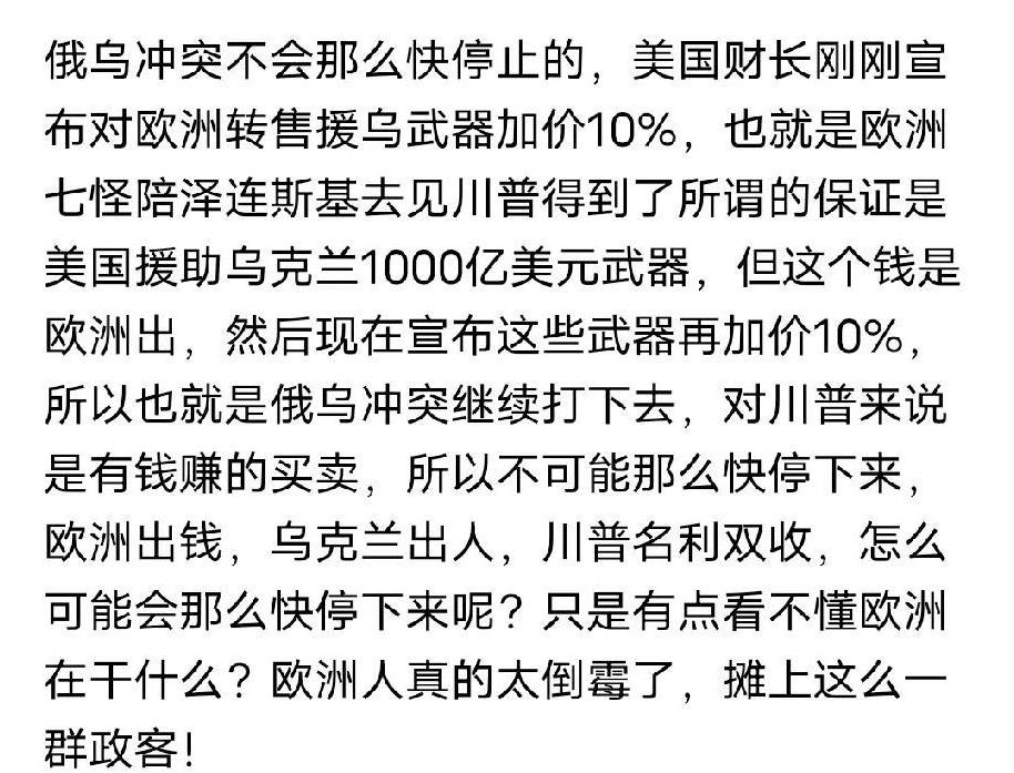公知经常否认“弱国无外交”这个道理,现在乌克兰又形象生动地演绎了什么叫“弱国无外交”,表面上看,乌克兰有欧洲支撑着,但是你看欧洲七大金刚在川普面前就像小学生一样,听着川普指点江山!再看看川普怎么接待普京的,再看看川普怎么对待欧洲和乌克兰的,难怪还不够说明“弱国无外交”吗?欧洲就是不愿意走自主战略,沦落到这种境地,我觉得欧洲的军事力量应该是空有其表,要不然为什么宁愿受川普这么大的羞辱,也不愿意自己出兵去帮助乌克兰,估计连欧洲的军工生产都有问题,要不然为什么不能自己生产武器去支援乌克兰,非得跟美国买,所以欧洲内部肯定是出问题了,空有其表而已!