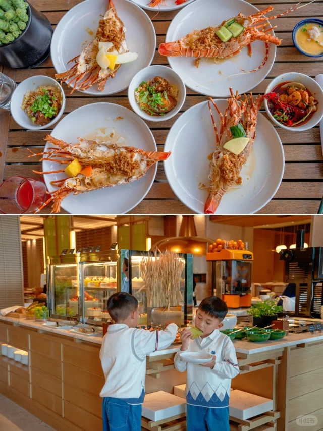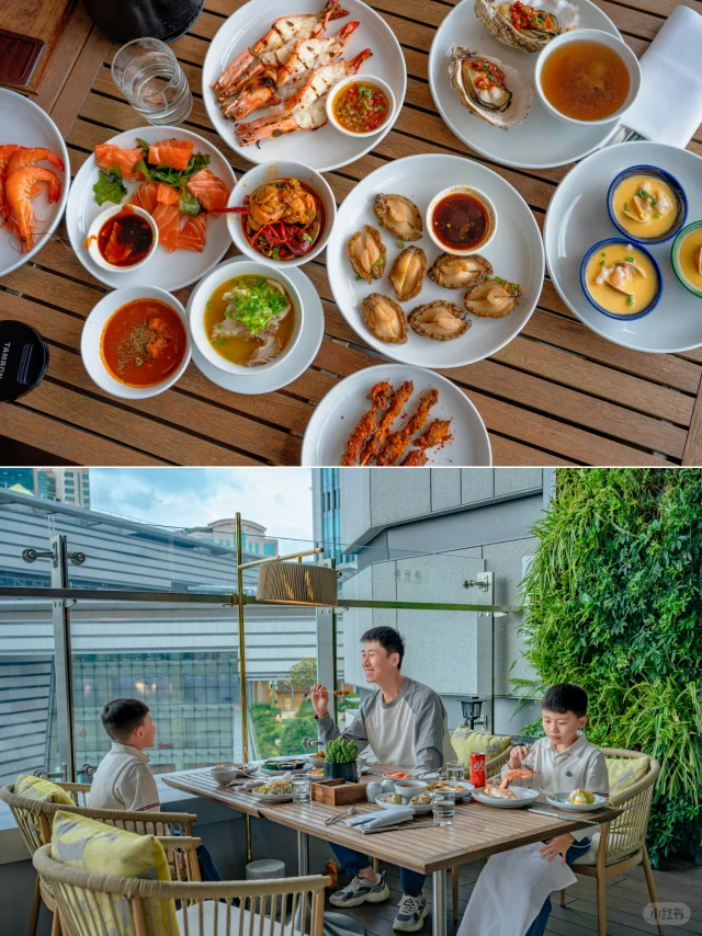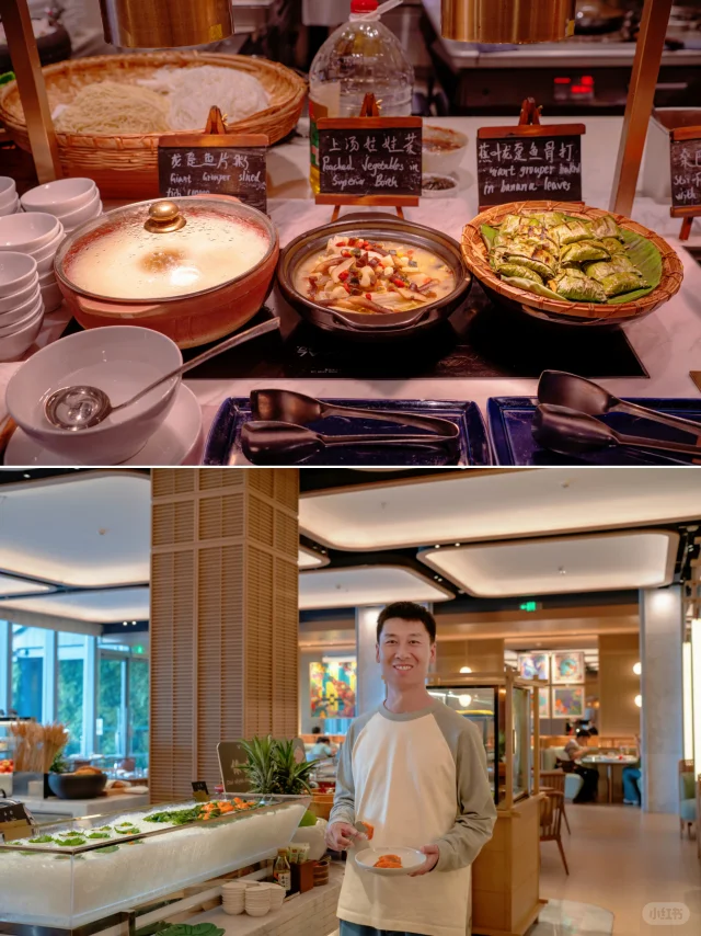 ⭐️烁庭自助晚餐更不用说了,不限量的三文鱼、虎虾,烤鳗鱼、菌子披萨、现开生蚝、脆爽酸辣的鱼汤,还有小锅米线、糯米油条这些本地娃娃从小吃的味道。