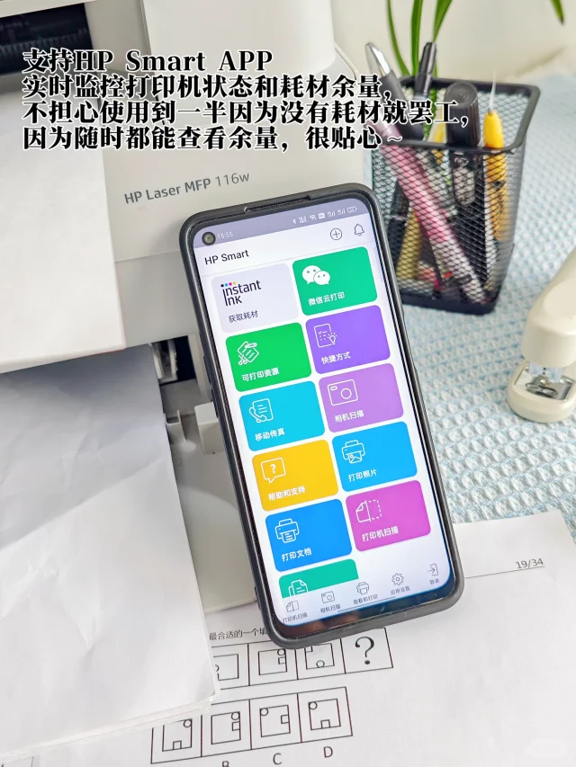 对了,它还能扫描复印,复印证件啥的几秒钟就搞定了。支持HP Smart APP实时监控打印机状态和耗材余量,不担心用到一半因为没有耗材就罢工,随时都能查看余量,很贴心~