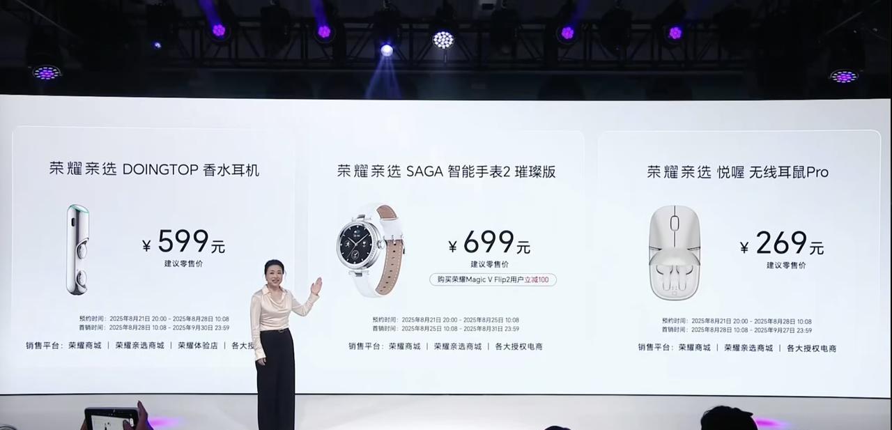 【荣耀新品价格公布】 荣耀Magic V Flip2:12 + 256GB版售5499起 荣耀亲选DOINGTOP香水耳机:售599 荣耀亲选SAGA智能手表2 璀璨版:售699 荣耀亲选悦喔无线耳鼠Pro:售269 内置耳机的那个鼠标还蛮有意思,你们喜欢哪款新品[吐舌]