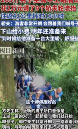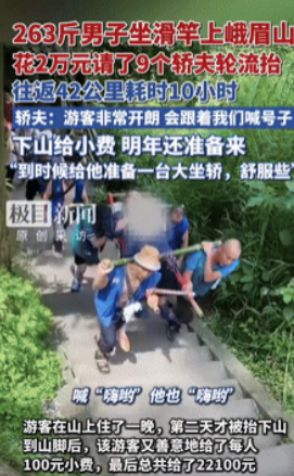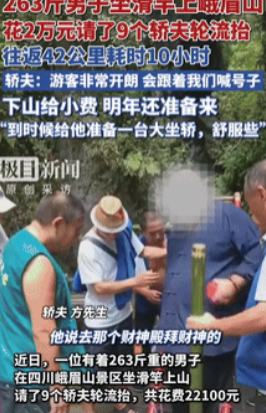 有钱就是任性!四川,一263斤男子想爬峨眉山,可又嫌自己爬太累,于是灵机一动,花2万请了9个轿夫抬自己,往返42公里耗时10个小时,在下山时还多给了消费,而男子接下来的一番话,则让轿夫们更高兴了! 据极目新闻8月21日的报道,男子本想着是到峨眉山上的财神殿,拜一下财神,可因为身体不太方便,自己爬不仅又累,可能还完不成。 直到他在山下看到有轿夫时,他就想到了解决办法,那就是请轿夫来,把自己给抬到山上去。 就这样,他以2万元的价格,找了9个轿夫,因为轿子只能同时4个人抬,所以就需要轮流换着来,这样轿夫们也能轻松些,剩下的则去前面引路,要是谁扛不住,再让他顶上。 虽然整个行程总共有42公里,这一路扛下来也累到不行,但这几位轿夫还是挺开心的,毕竟这种大单子,几年都不能一定能碰到一次。 像他们平时遇到的游客,都是出于稀奇体验一下,选择都是3公里480元的项目,而男子这一出手就是2万,算下来每个人都能拿2千多。 而在返程下山的时候,男子还给他们9个,每人1百块的小费,虽说山上有财神,但此时此刻,男子就是轿夫们的真“财神”。 随后男子也说了,等到明年的时候,他还会再过来,轿夫也承诺,会专门给他准备个更舒服的轿子。 那么对于这件事情,您有什么想说的呢?