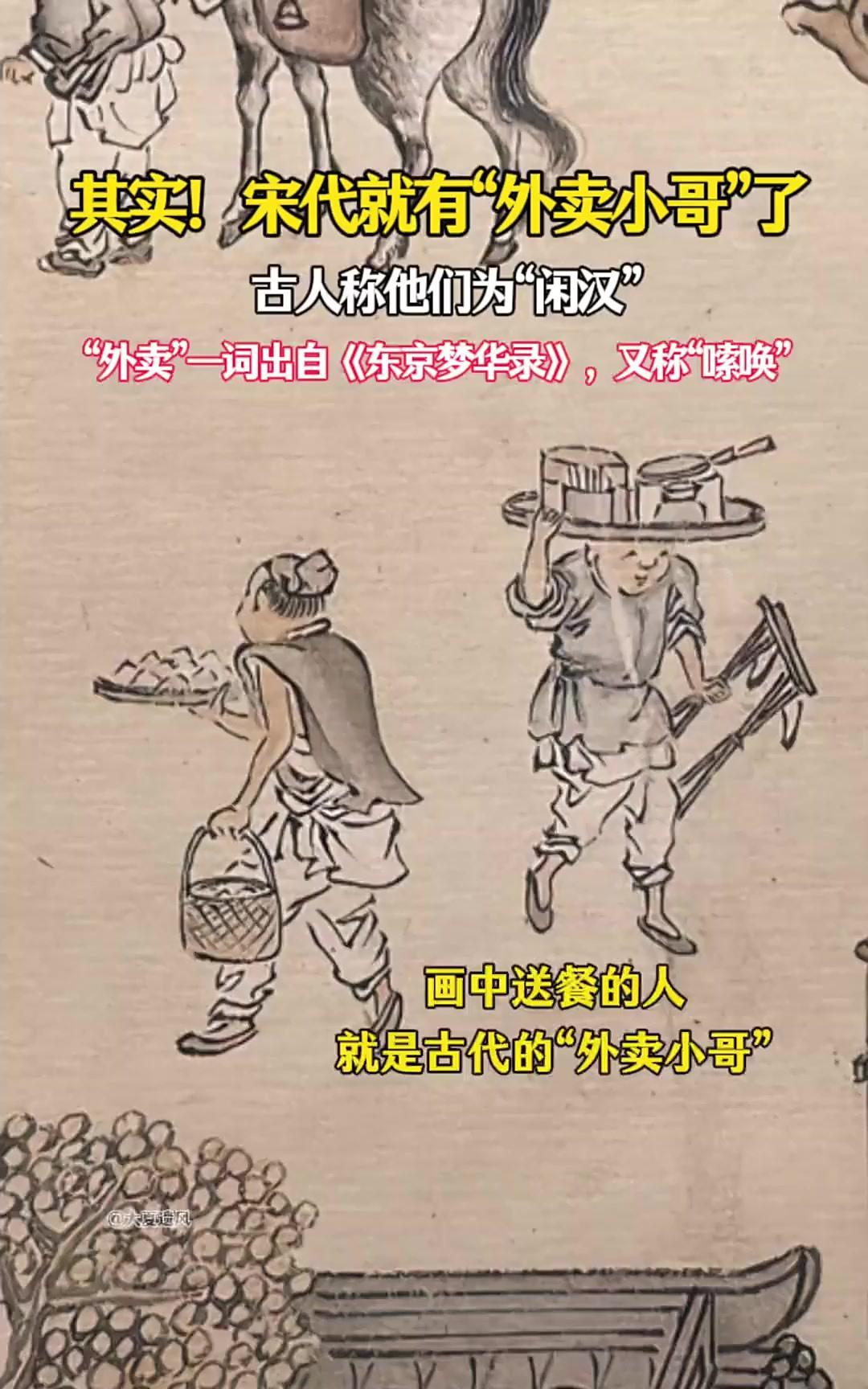 古代也有外卖?古人是如何点外卖的? 别觉得点外卖是现代人的专利,其实早在宋朝,大城市里的人们就已经玩得很娴熟了。当时的东京汴梁和临安这些大城市非常热闹,人口特别多,饭馆酒楼比比皆是,无论白天还是晚上,街头都很热闹。 随着社会节奏变快,大家对吃饭也有了新的需求,很多人做生意忙到顾不上自己做饭,更多时候也图个省事,直接去饭馆下单,让饭馆送饭上门,成了当时不少人的日常。 宋代外卖流行,不只是因为人多、饭馆多,还因为吃的选择实在让人眼花缭乱。 那会的烹饪技术明显进步了,炒菜已经很常见,铁锅和植物油的普及让很多新菜式都能做出来,外卖选项丰富得让人挑不过来。 猪肉、羊肉、鱼虾、野味无所不有,平头百姓能吃上肉也不新鲜,饭馆菜单能找到各地风味,什么人都可以点到自己喜欢的,选择多了,大家自然愿意多点外卖,这也让厨师们比着花样做菜。 便利的生活离不开饭馆老板的小心思,为了让外卖到家还能保持温度,宋朝人设计了“温盘”,这个饭盒中空,灌进热水后就能把菜保温,到客人手里往往还是热腾腾的。 服务贴心,自然赢得认可。点餐的人只要去饭馆下单,说好送到哪、什么时候到家就行,饭馆伙计专门负责把饭菜送去。 很多人家甚至和饭馆签了长期合同,每天按时送三餐,和现在的订餐服务很像 这样的做法,在当时的城市非常常见,商人、手工艺人、普通市民都能享受到不做饭的便利。 值得一提的是,哪怕是皇帝,有时候也会对市井美味“动心”,宫里头虽说山珍海味不少,但吃多了也会腻,有时外面热腾腾的家常菜还是能打动人心。 皇帝偶尔也会让人去民间有名的酒楼点几道菜送进宫,换换口味。 可以说,外卖美食连最高权力的人都逃不过,不管身份高低,大家追求的都是真正好吃的新鲜菜,这份“烟火气”隔着宫墙都能传递进去。 宋代的外卖文化,其实反映的就是当时城市生活的快节奏与多元化,人们不只是为了解决温饱,更注重吃得有滋有味。从各种菜肴的搭配到送餐过程的用心,每个细节都见得出那个时代对美好生活的追求。 纵然今天科技发达,外卖一点手机就能下单,但回头看,宋朝那种生活方式和用心服务,依然让人感到温暖,这种连续千年的人间烟火,就是吃饭这件小事带给我们的真实幸福。