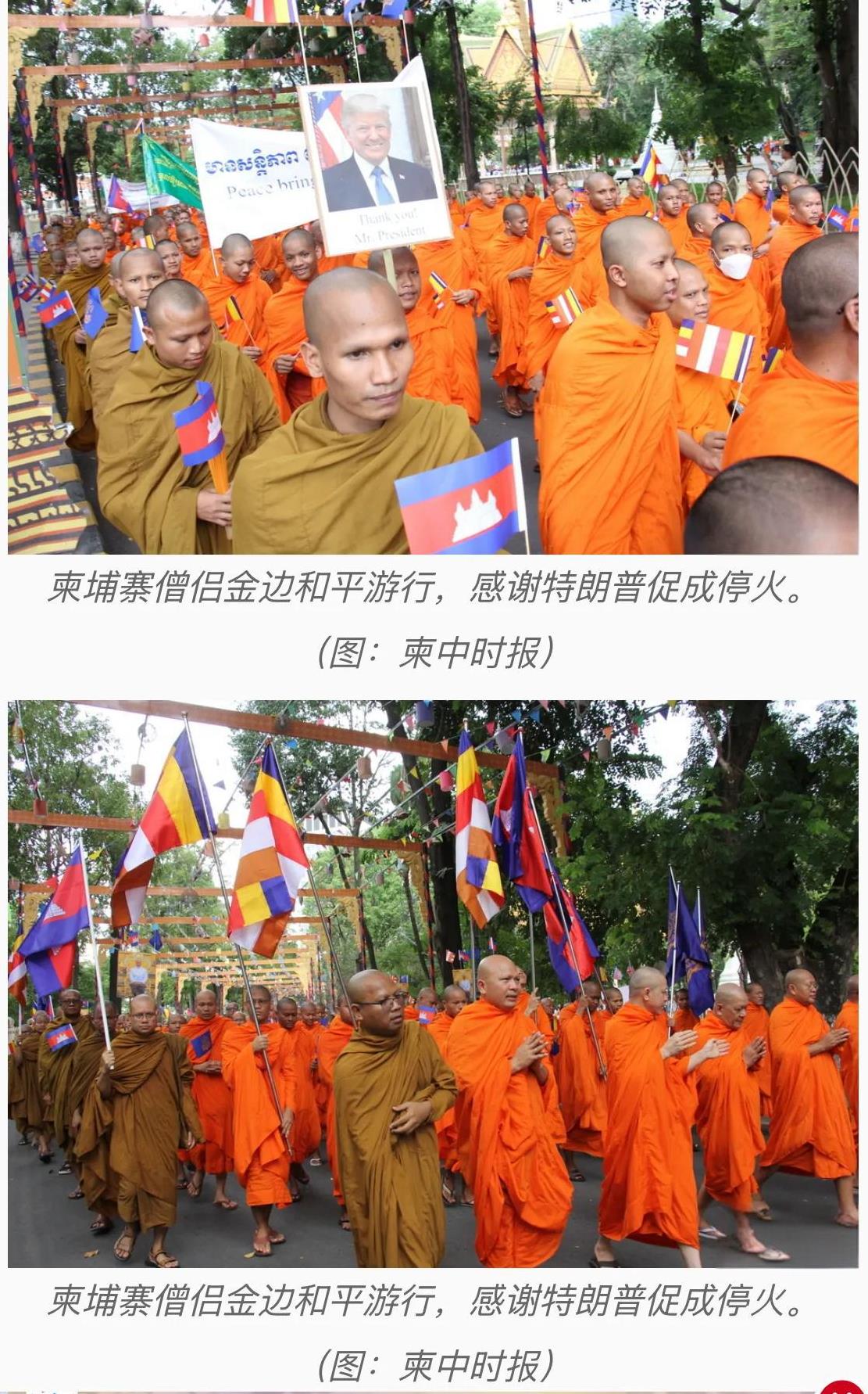 据柬中时报,8月10日下午柬埔寨2569名僧侣在金边举行和平游行,旨在祈愿柬泰永久和平,并向美国总统特朗普致谢,感谢其为促成柬泰停火所作贡献。 这些僧侣与尼姑手举特朗普照片,徒步至美国大使馆,沿途诵经祈愿和平,并宣读信件表示支持提名特朗普获诺贝尔和平奖。