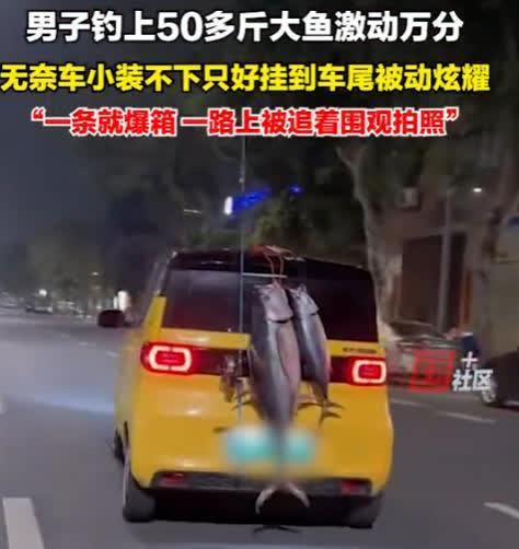 “这就是命中注定!”4月6日,广东阳江,一男子和朋友去海钓,意外钓到了50多斤重的大鱼,男子表示车太小,装不下,直接挂在了车后面,看的别的钓鱼佬羡慕坏了,网友:还是被他装到了! 4月6号,在广东阳江,有个哥们儿和他朋友一起出海钓鱼玩。本来嘛,这就是一次普普通通的放松活动。可没想到的是,因为钓到了一条50多斤重的大鱼,这俩人一下子就成了大家议论的热点。 那天海上特别平静,他们坐着船就出海了,跟平常一样扔下鱼竿就等鱼上钩。时间一分一秒地过去,大家伙儿都以为今天可能没啥收获了。结果,突然之间,那哥们儿手里的鱼竿猛地被拉了一下,力度大得很。他心里一激灵,知道这次钓到的肯定不是小鱼小虾。他沉住气,一点点地收线,慢慢地,水下有个大家伙的影子露了出来,那是一条超级大的鱼,在水里拼命扑腾呢。 这哥们儿和他朋友费了好大劲儿,终于把这大鱼给拽上了船。一称,乖乖,这条鱼得有50多斤重呢!而且啊,还有条小鱼跟着一起被钓了上来,真是“一送一”啊!有网友看了照片说,这很可能是金枪鱼,这种体型很少见,而且市场上能卖不少钱呢。钓完鱼回家路上,那哥们儿把钓到的大鱼绑在车屁股后面,一路上吸引了好多人的眼光。别的钓鱼爱好者看到了,都投去羡慕的眼光,还有人开玩笑说:“这家伙真是走运到家了!”“小车也能装大鱼,运气真不错啊!” 就这样,他带着这条“福星鱼”高高兴兴地回了家,这事儿不仅成了朋友圈里的热门话题,还在网上火了,让大家伙儿都围观了一把。