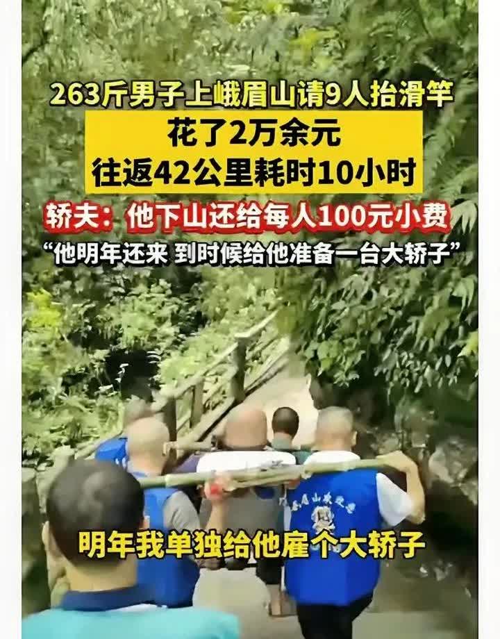 四川一男子上峨眉山拜财神,263斤重的他,花2万多请了9人抬他上去,往返42公里,耗时10小时。 此行男子重263斤,走不了多远,往返两地花了2万多,九人抬他上山,九人抬他下山。 每位轿夫100块小费也给了。 这九个轿夫可高兴了,抬得腰不酸背不痛,十块钱一公里,往返加起来赚五百块。 轿夫们也是分成两组轮流抬,期间互相鼓劲,话也不少,气氛轻松愉快。 男子在山上住了一晚,明年还来,轿夫笑称要准备大轿子。 此次一行,让男子享受了旅行的乐趣,也让轿夫们小赚了一笔。 网友:无论工作是什么性质的,都要互相尊重!