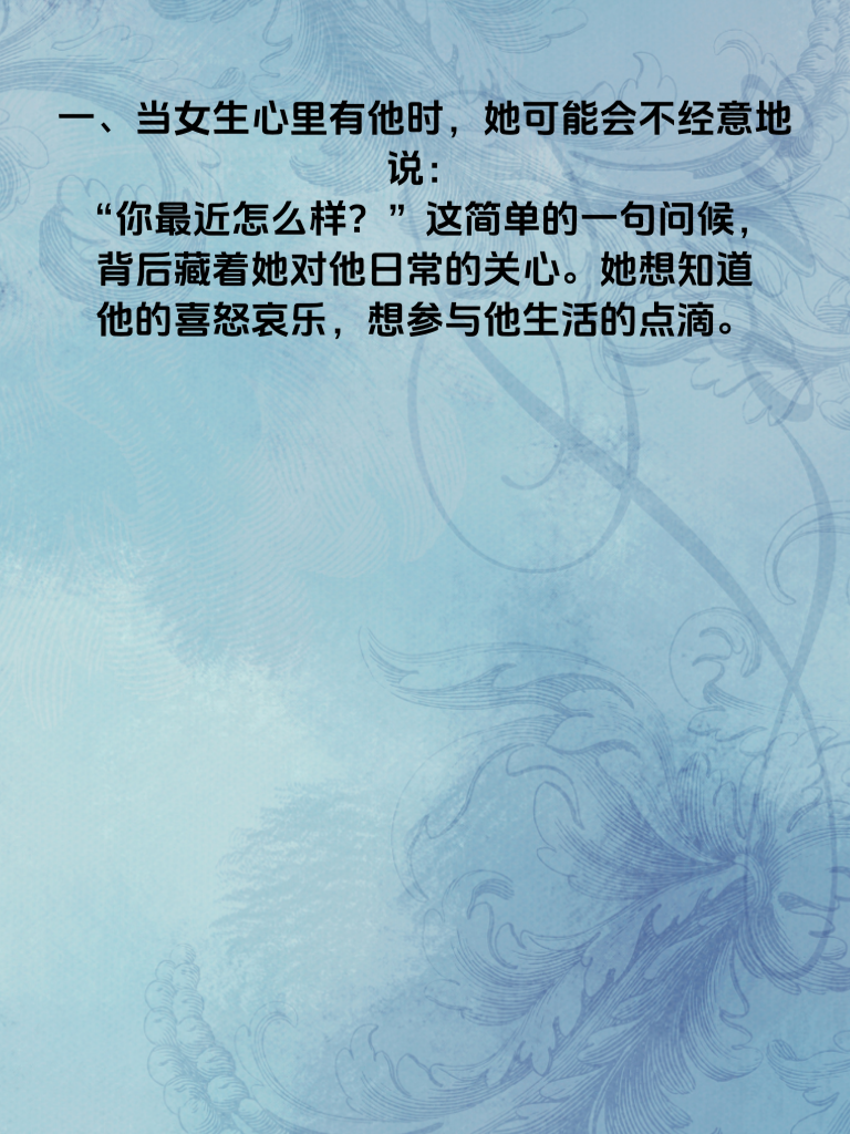 一、当女生心里有他时,她可能会不经意地说:“你最近怎么样?”这简单的一句问候,背后藏着她对他日常的关心。她想知道他的喜怒哀乐,想参与他生活的点滴。 二、“我今天看到一个东西,马上就想到你了。”能说出这话,说明他已深深烙印在她心里。生活中任何细微关联都能让她第一时间联想到他,这是心动的信号。 三、“要是你在就好了。”表明她渴望他的陪伴,在她心里,他的 presence 无比重要。无论是面对困难还是享受美好,她都希望他在身旁。 四、“你觉得这样好不好?”这句体现她重视他的看法,在意他对自己行为或想法的评价。她试图在他面前展现最好的一面,也期待两人能有更多情感上的共鸣。