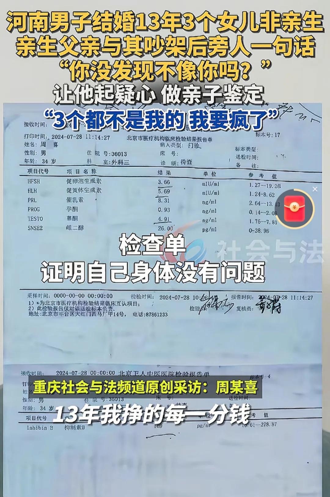 周某喜称,结婚13年,妻子给他生了三个女儿,其中二胎是双胞胎。为了给妻子和女儿更好的生活,13年来他长年在外务工,很少回家,妻女与家庭成员一起生活。他非常体谅妻子带3个孩子的不容易,每一分钱都寄回了家。 直到有一天,他与自己的亲二伯吵完架,旁人的一句,“你没发现孩子不像你吗?”让他起了疑心,做了亲子鉴定确认3个女儿不是他亲生的。 他怀疑3个女儿是亲二伯的,但二伯拒绝做亲子鉴定。 法院判决周某喜与妻子离婚后,前妻带着女儿搬去与二伯一起生活,在周某喜的再三争取下,今年8月,前妻同意赔偿15万抚养费,但得分期一年一万。 为了担心女方将过错归咎为自己,周某喜在医院做了生育机能体检,他的一切指标正常。 只能说,没有男人在身边,女人耐不住寂寞,从半推半就到愉快地迎合,与姘夫在一起的时间比丈夫都多,生了三个孩子,这与以夫妻关系公开同居没啥区别,离婚后马上两人住在一起,亲二伯即使不做亲子鉴定也应该能坐实是孩子的亲生父亲。 赔偿区区15万元钱,妻子和3个半大的孩子都成别人的了,周某喜家没了,一生被毁了,如果没有实质性惩治,这种让丈夫当冤大头,替别人养孩子的事件会更多。 15万抚养费分期付款,一年一万,大概率还得每年去讨要,被羞辱,相当于每年要将耻辱的伤疤揭开,是个人都受不了。 大家发现吗?这种冤大头的男人都是对妻子太忠诚,太好的男人,但凡留点心眼,也不至于全村人知道了,就他不知道,但凡有点个性,妻子也不敢随便上别的男人的床,还将别人的孩子生下来,别的男人即使垂涎三尺,也不敢有非分之想。 现在老实人是贬义词,我不赞成人太老实,也不赞成单方面爱得太满,否则会被对方瞧不起,在你头上做窝,大家认为呢?