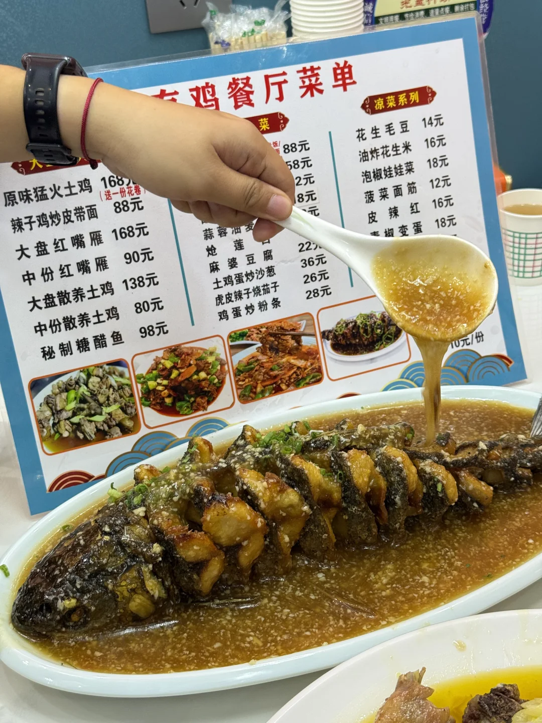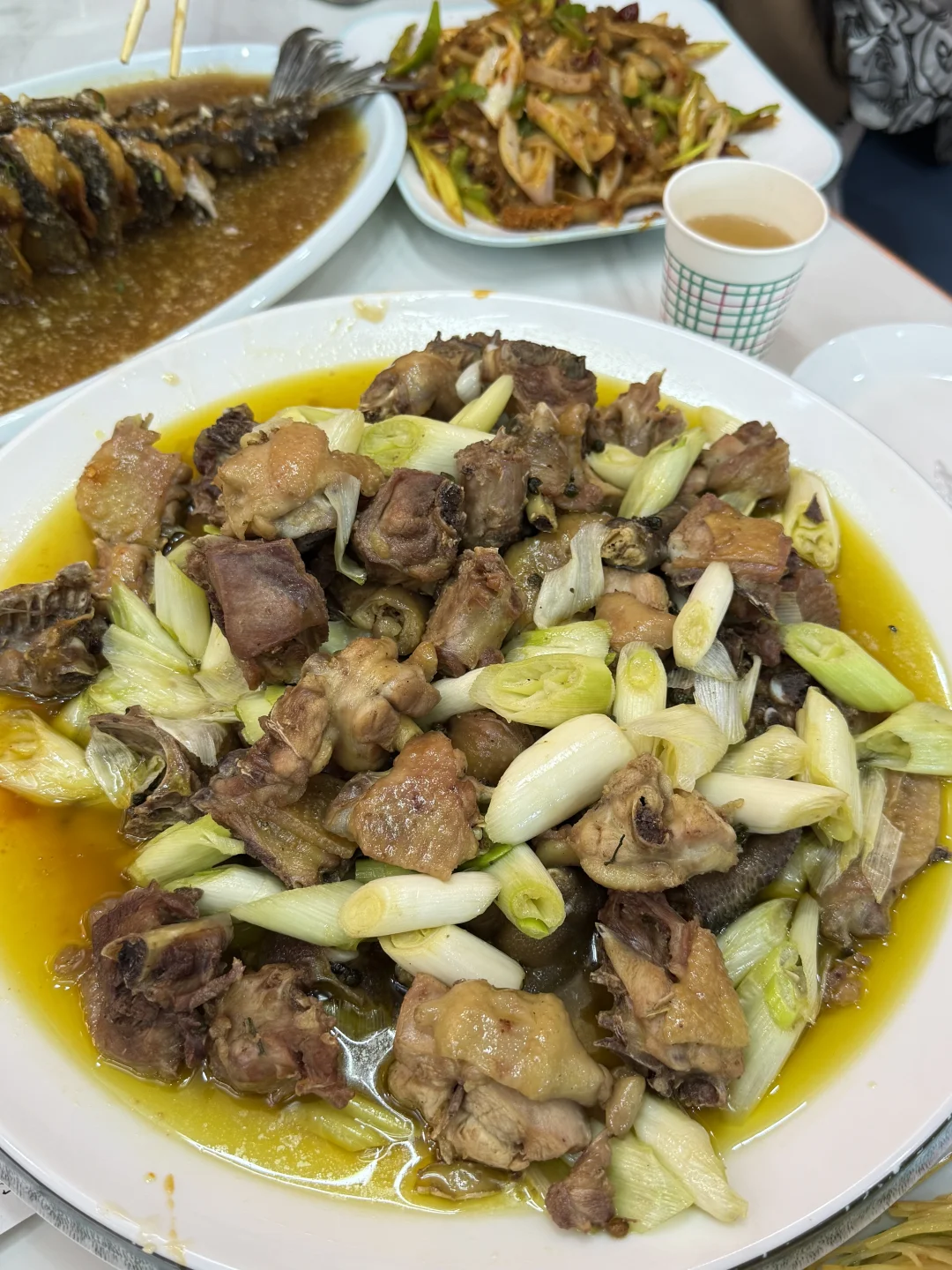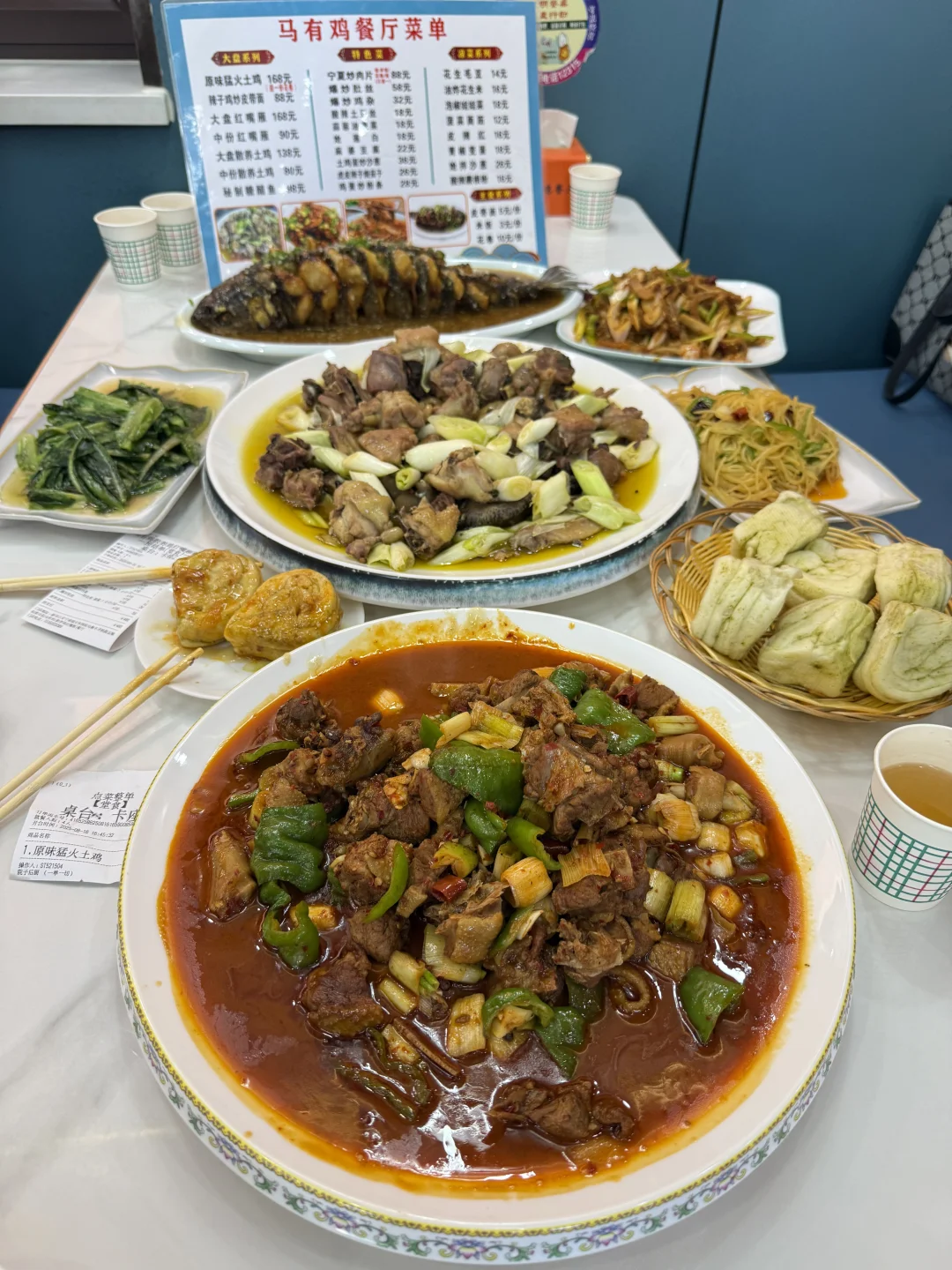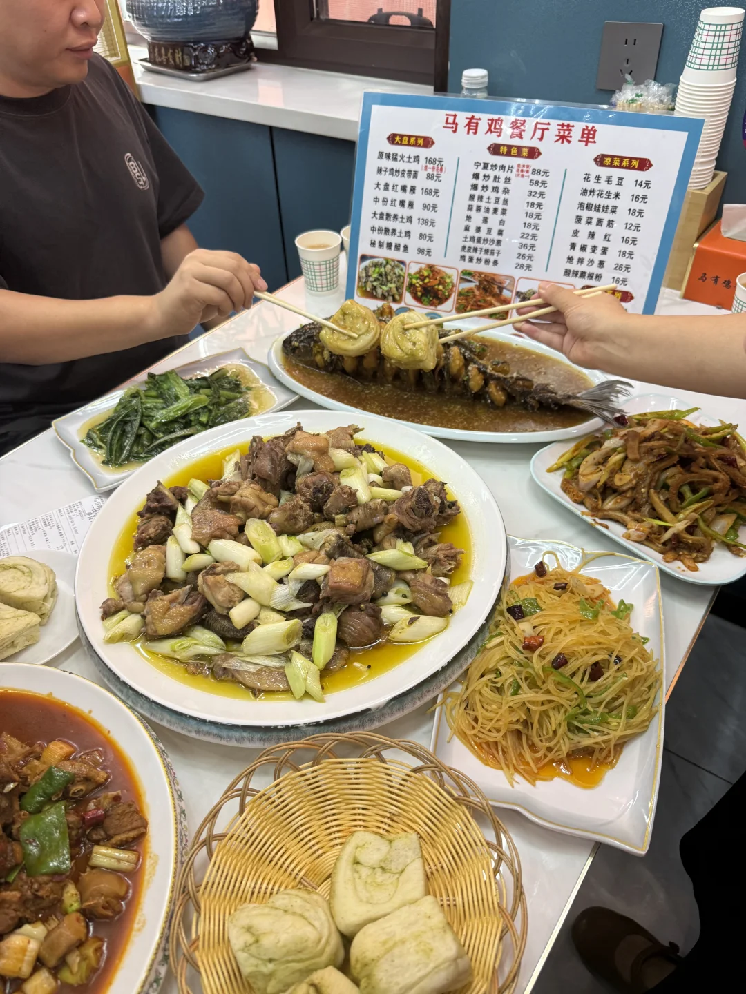 和家人开车过来吃这家大盘鸡,份量实在,用的是散养土鸡🐔,鸡肉紧实,脂肪也不多,能吃出本身的鲜香味,没有腥味。做法还挺特别,先露天大火炒,加的还是矿泉水,再小火慢慢炖,把肉香都炖出来了。配的花卷蘸汤汁,一口下去很🈵️足。 红嘴雁肉质嫩嫩的,小孩子爱吃,口感和味道都可以😌,处理的好的肉🈚️肉腥味,吃着有不一样的感觉。 店里挺干净,服务也热情,老板娘会耐心介绍菜品。生意挺好的,想去的话可以早点哦,免得饭点等位置~