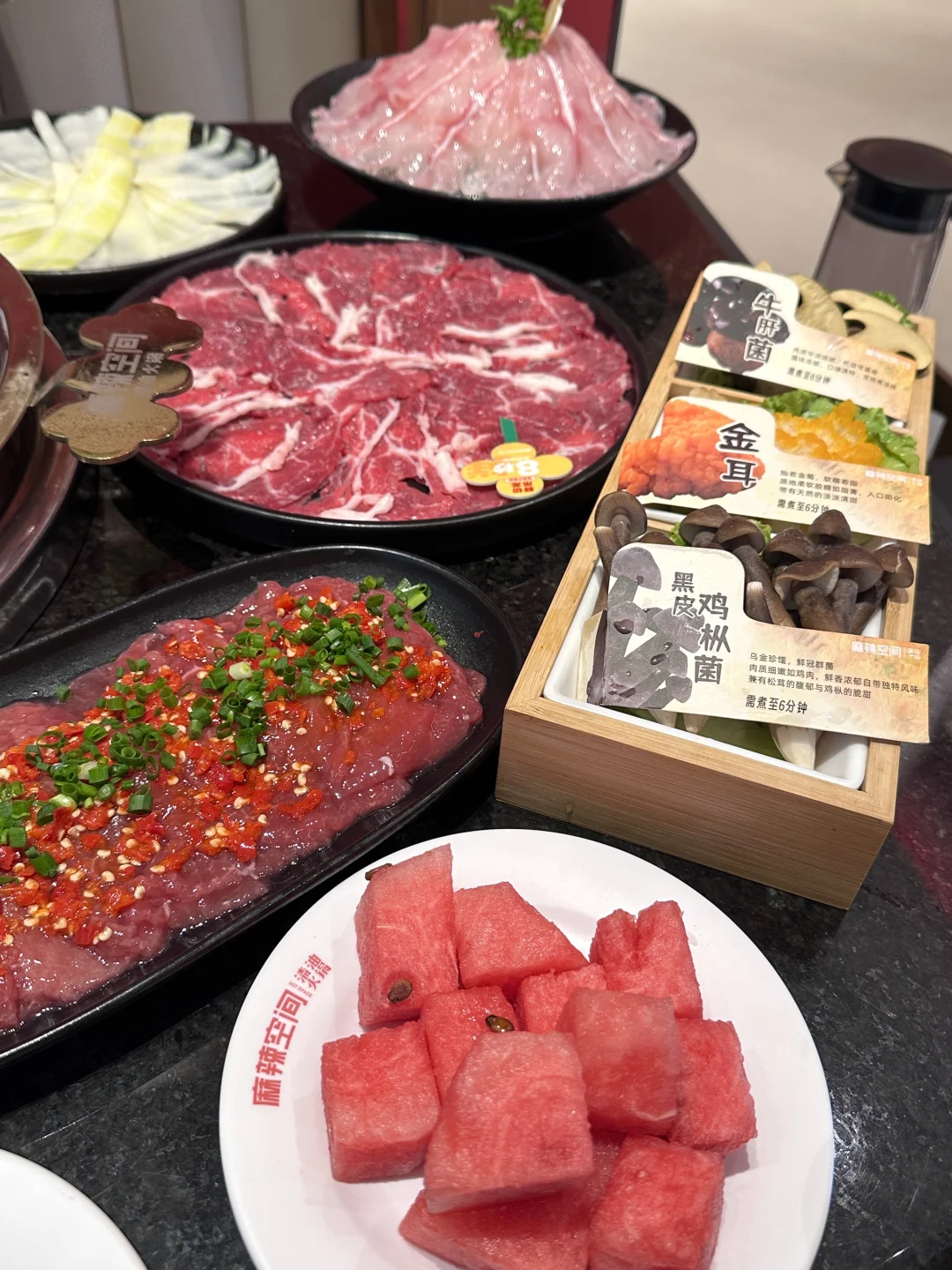 这个麻辣空间我真的太爱吃了!!如果要吃清油火锅麻辣空间一定是我的第一选择 锅底一定要加麻加辣!麻麻辣辣的真的好香!闻到这个味道我就会想流口水的程度 最近重新装修过了 环境变好了 服务也变好了 小姐姐一直不停地过来关注你的需求 帮你下菜 问厕所在哪 甚至说带你过去 感觉惊呆了 服务咋变这么好?感觉可以媲美海底捞了 还有免费的绿豆汤和粥可以喝 都熬的挺不错的 最爱吃的还是免费西瓜🍉 特别新鲜 超级甜 没菜刀味儿 一点也不抠搜 西瓜没了马上就会续满 我一个人吃了三大盘 哈哈哈免费的可得多吃点 菜品略贵 但是份量都很扎实 希望可以做小份便宜一点 我真的只点了几个菜就吃饱了 想多吃几个菜😭 没有我爱吃的胖胖金针菇 只有银针菇 老板麻烦能不能把这个菜加上!