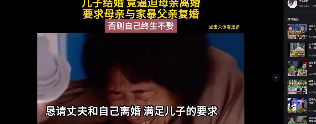 湖南,女子被丈夫打骂数年,忍受不了的她只好选择离婚,15年后,23岁的儿子,看她和现任丈夫过得你恩我爱,顿时心里不爽,逼着女子和现任离婚,和爱动手的父亲复婚,否则他就终身不娶,打一辈子光棍,这位母亲该何去何从? 湖南有个叫陈萍的女子,年轻时嫁给了一个对她不好的男人,婚后经常被老公打,特别是他喝了酒后。但为了孩子,她一直忍着。直到儿子八岁,她才下决心离婚,一个人出去打工。在外地,她遇到了现在的老公老何,他人很好,对陈萍也特别真心。这十五年来,她终于感受到了被人尊重和爱惜的感觉。 可是,最近她儿子来找她了,却带来了个大麻烦。儿子快结婚了,因为女方家里条件好,他怕被人瞧不起,居然要陈萍和老何离婚,再和前夫复婚。他甚至威胁说:“如果你们不离,我就不结婚了!”前夫老李也来求情,说他已经变好了。陈萍遇到了个大难题:一边是好不容易盼来的幸福生活,另一边却是亲生儿子的逼迫。她眼泪汪汪地跟老何说要离婚,可老何就是不同意。老何心疼她,不想让她再回那个火坑,更不忍心看她为了一个只顾自己的儿子放弃幸福。 陈萍最后决定还是留在老何身边,没有答应儿子的胡闹。这样一来,她和儿子的关系就僵了。但她心里清楚,真正的母爱不是老牺牲自己,而是要活出自己的样子。