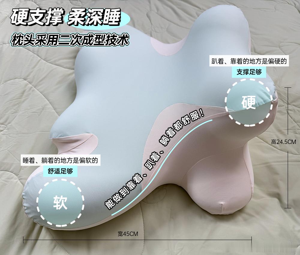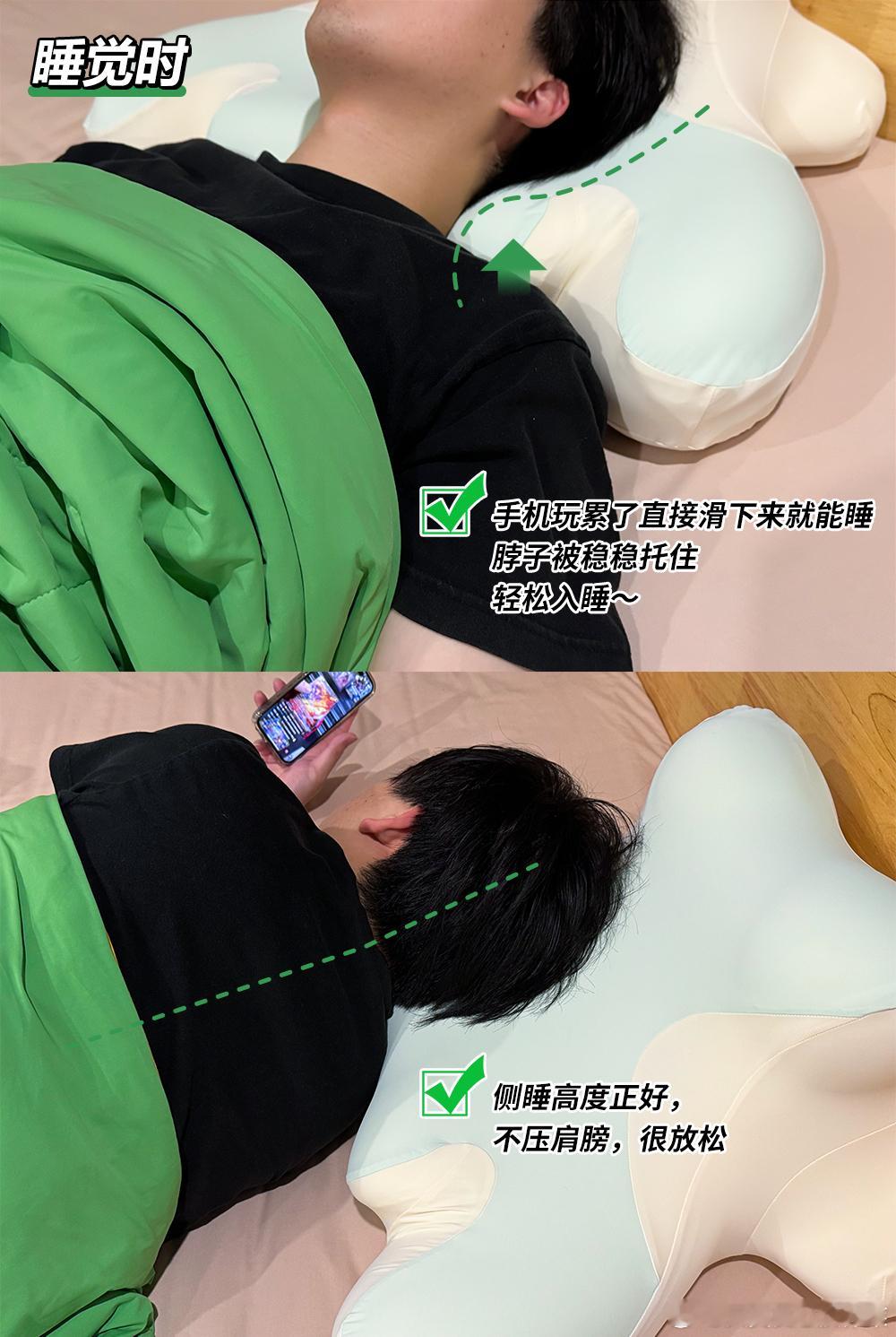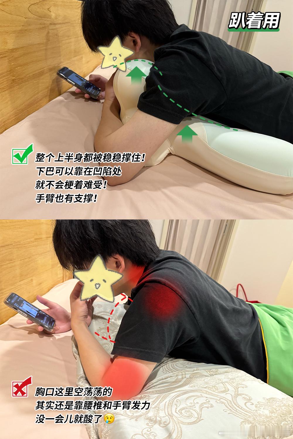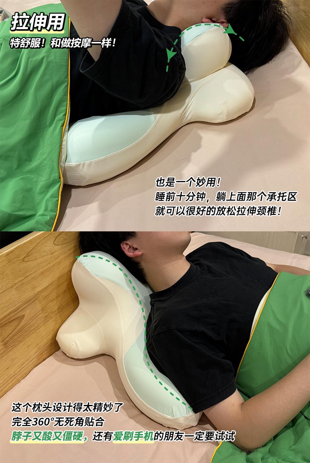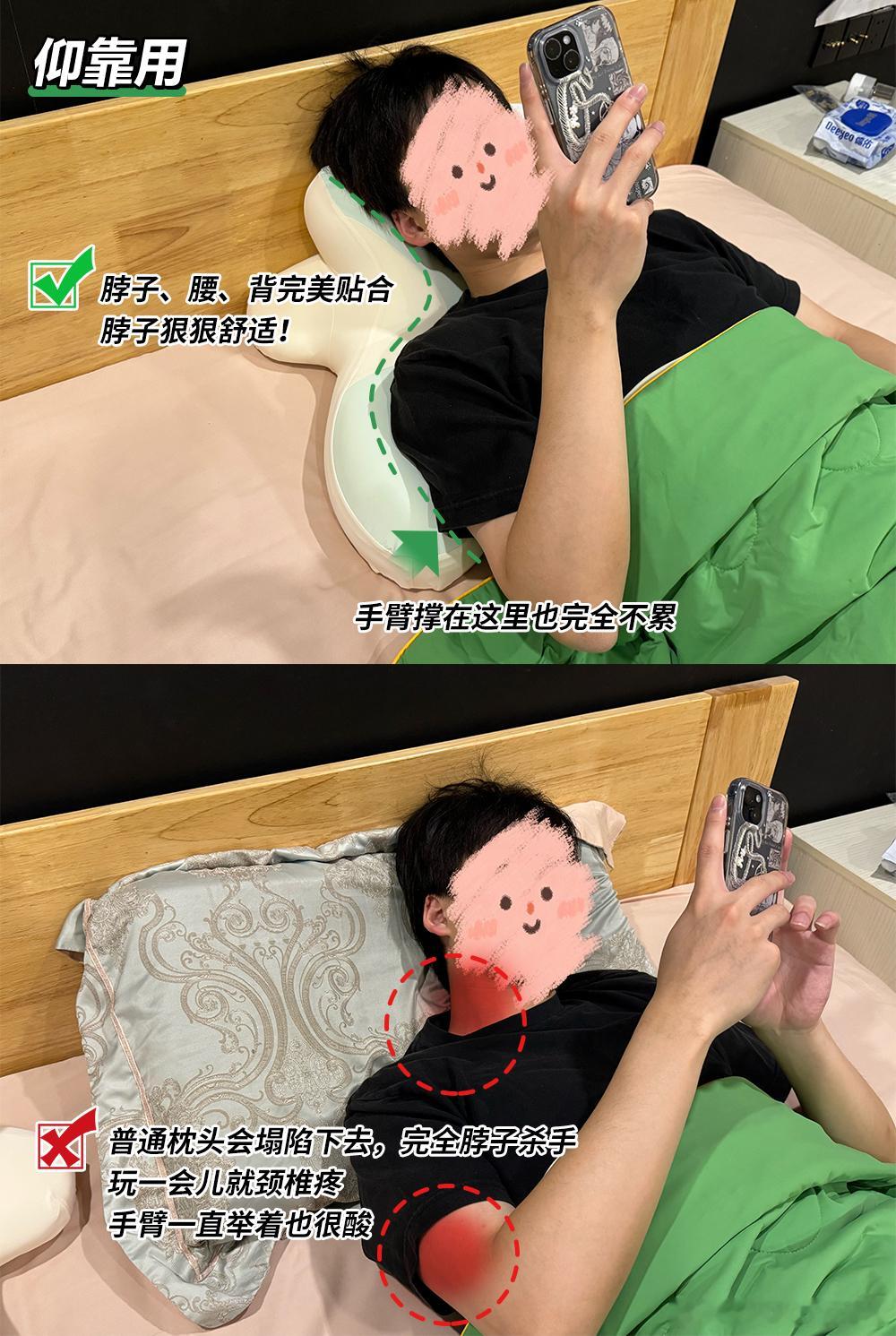下巴往枕头的专属凹槽里一卡,头稳稳托住,胳膊自然放两侧支撑面上,上半身都舒坦了。骨科医生提过,趴卧玩手机相对不伤颈椎,关键就在于它能强制抬头。 我这一个月刷下来,低头焦虑真少多了,脖子前倾的感觉也轻了。