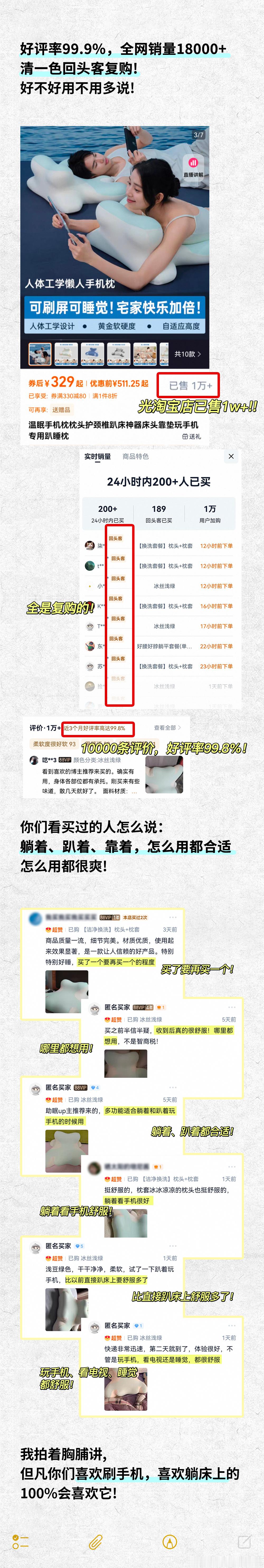 对比市面同类产品,这款的设计更讲究:分区更科学,正躺区够大,还专门为侧躺刷手机设计了放手区,细节体验确实更好。升级款还配了小枕头调节高度和贴合度,难怪口碑销量双赢——上架三个月,全网卖出18000+,好评率99.8%,不是没道理的。