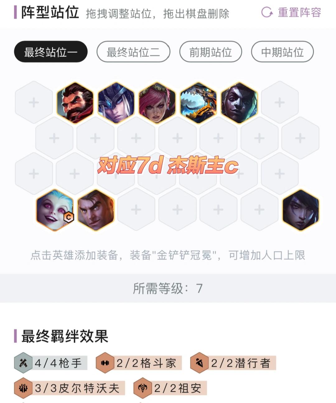 杰斯c:优点,杰斯是7d三星7级完美羁绊,同时能追三星金克斯蔚等二费卡,缺点是杰斯二星中期根本打不死剑姬,启动慢,上7快一点也要3-5,错过了三阶段的强势期,易掉血不稳定,最理想是开局三皮就玩杰斯主C。