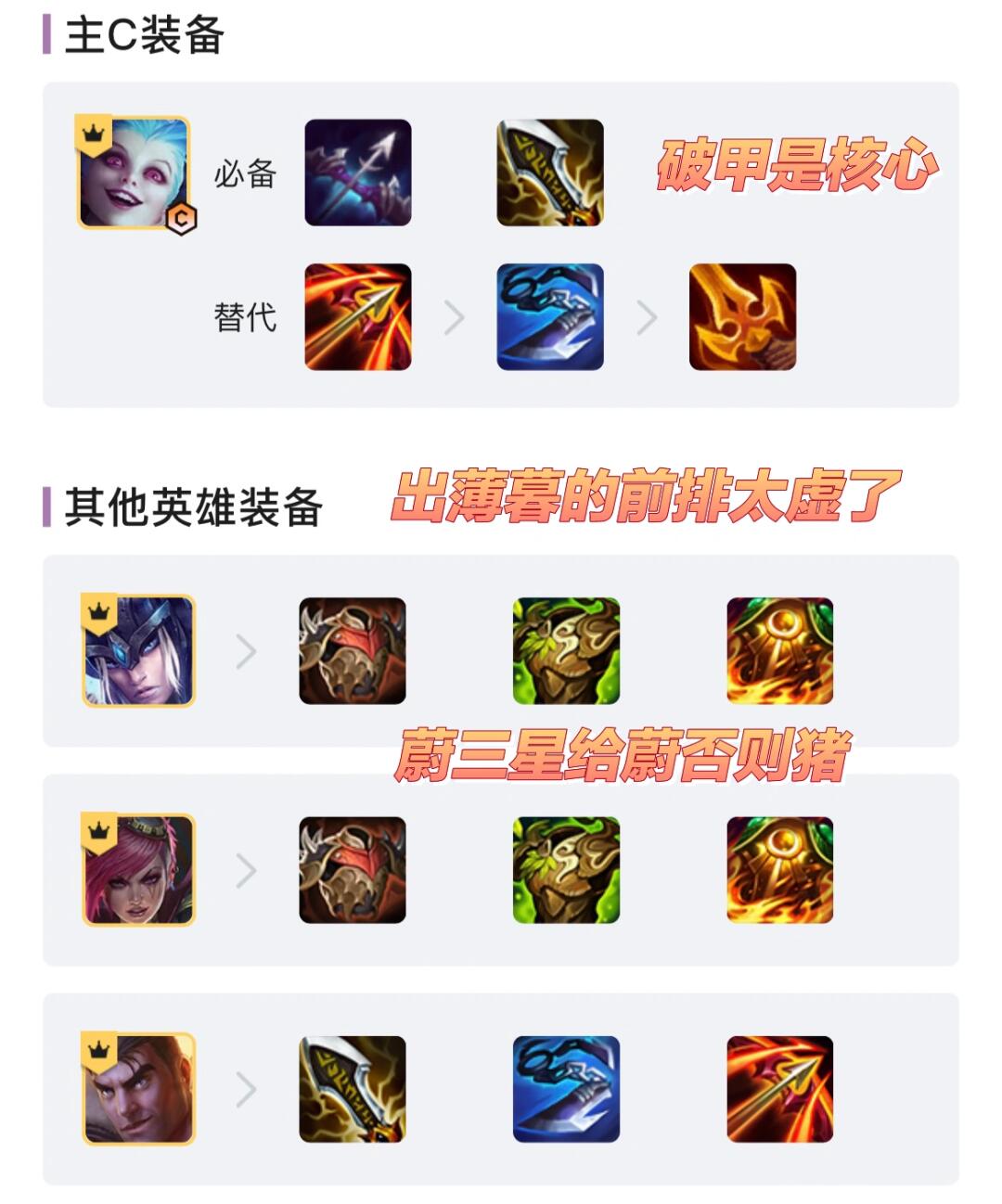 装备思路:优先做轻羽,这个版本反甲优先级特别高,有没轻羽两个阵容,亲测薄暮法袍效果一般,因为前排出薄暮对坦度收益偏低,而且死了就没了。