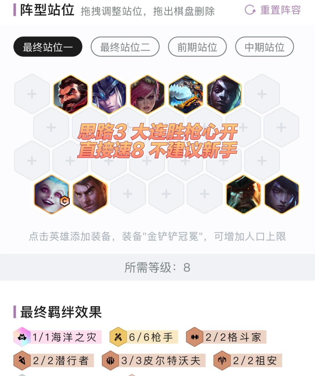 三是超级胡连胜开局,有枪手心的情况下,外面有同行或者自己牌来的不多,可速8开6枪,找多张紫卡,这样很稳定,大概前四,后期上限也不低,二星橙卡就能吃。