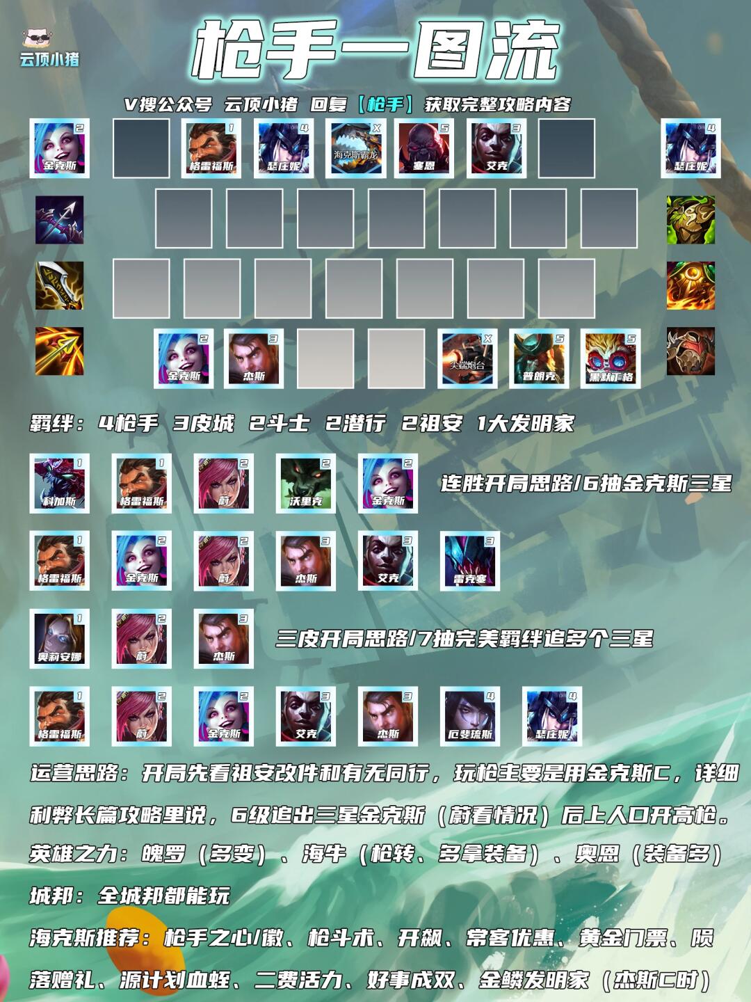 二是正常开局,还是建议金克斯主C,这是吃分最稳定的枪手玩法,六人口追出三星金克斯(蔚看数量情况)后开四枪挂高费。