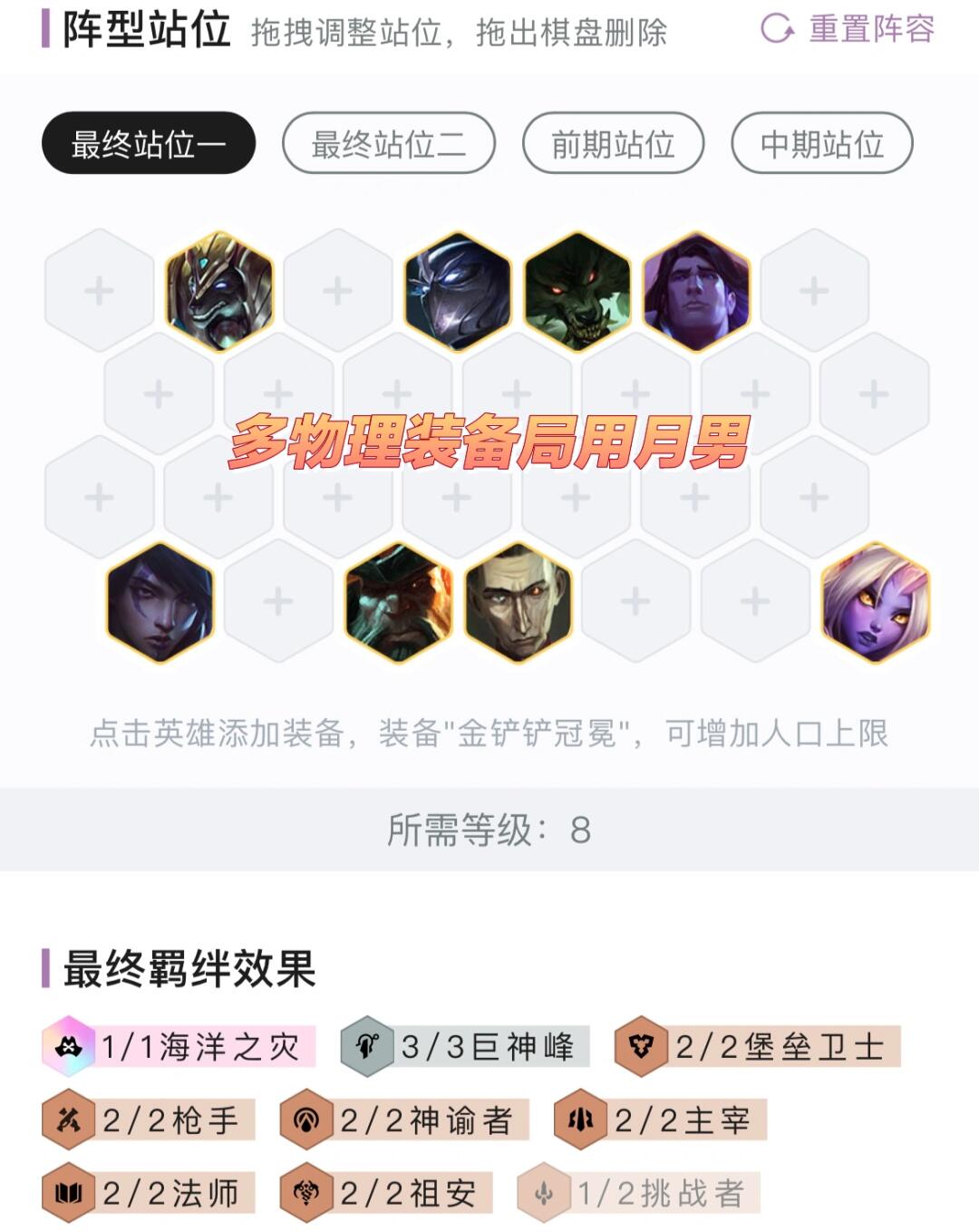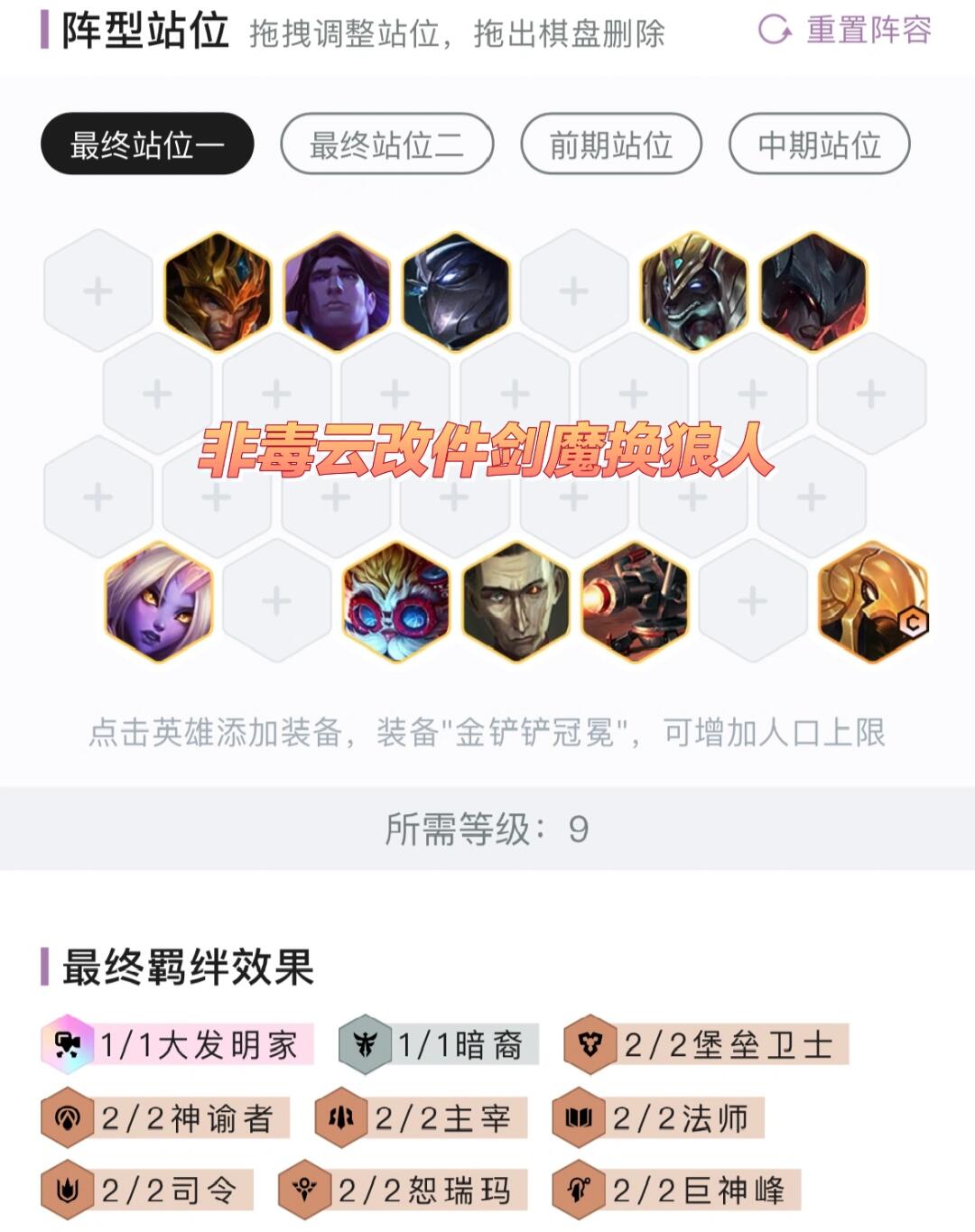 阵容后期可挂大头/剑魔/船长等,如果祖安是毒云,则狼人贯穿到底,如果独家没人卡牌在八人口追三星更好。