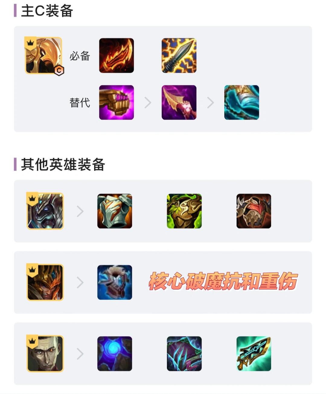 3、阵容很吃运营和变通能力,需要多联系两三把找找节奏,重伤和破魔抗对于整体非常重要。